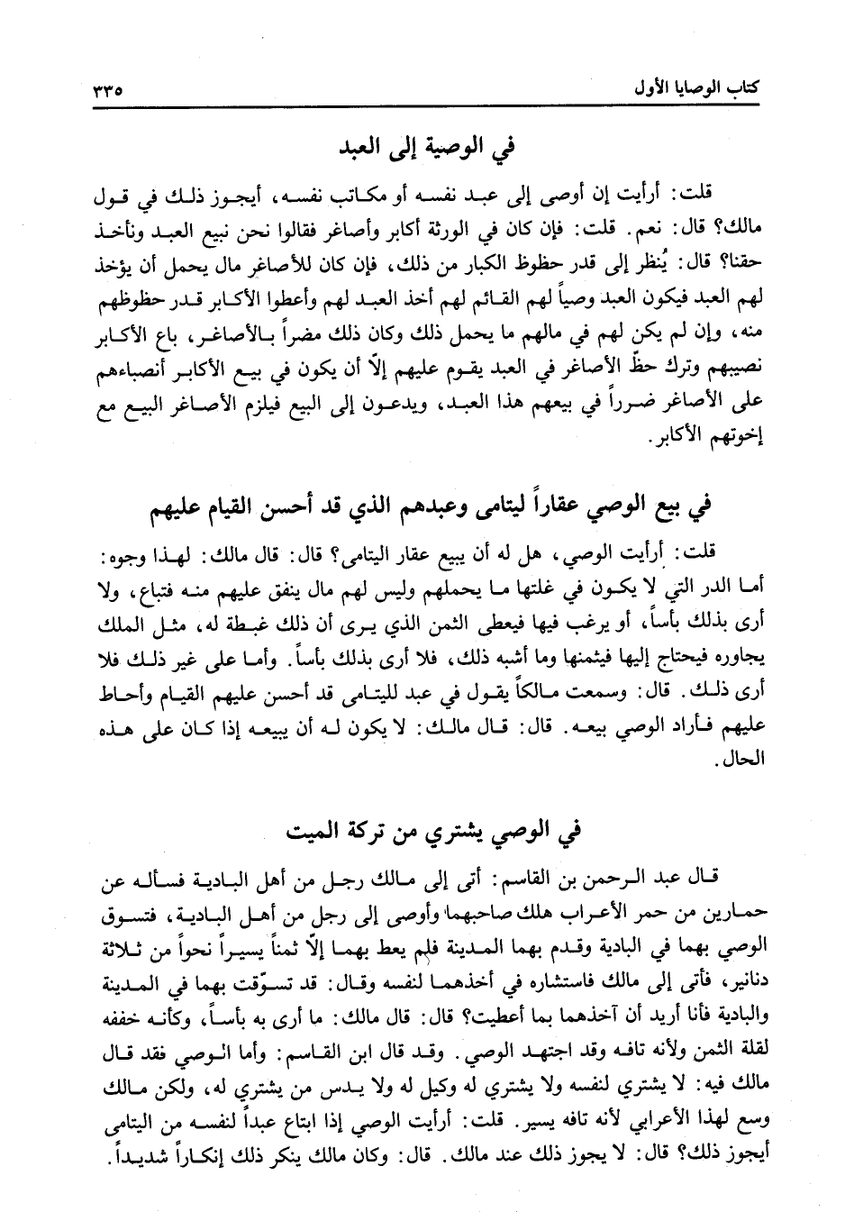 ِ قَالَ عَبْدُ الرَّحْمَنِ بْنُ الْقَاسِمِ: أَتَى إلَى مَالِكٍ رَجُلٌ مِنْ أَهْلِ الْبَادِيَةِ فَسَأَلَهُ عَنْ حِمَارَيْنِ مِنْ حُمُرِ الْأَعْرَابِ هَلَكَ صَاحِبُهُمَا وَأَوْصَى إلَى رَجُلٍ مَنْ أَهْلِ الْبَادِيَةِ، فَتَسَوَّقَ الْوَصِيُّ بِهِمَا فِي الْبَادِيَةِ وَقَدِمَ بِهِمَا الْمَدِينَةَ فَلَمْ يُعْطَ بِهِمَا إلَّا ثَمَنًا يَسِيرًا نَحْوًا مِنْ ثَلَاثَةِ دَنَانِيرَ، فَأَتَى إلَى مَالِكٍ فَاسْتَشَارَهُ فِي أَخْذِهِمَا لِنَفْسِهِ وَقَالَ: قَدْ تَسَوَّقْتُ بِهِمَا فِي الْمَدِينَةِ وَالْبَادِيَةِ فَأَنَا أُرِيدُ أَنْ آخُذَهُمَا بِمَا أَعْطَيْتُ؟