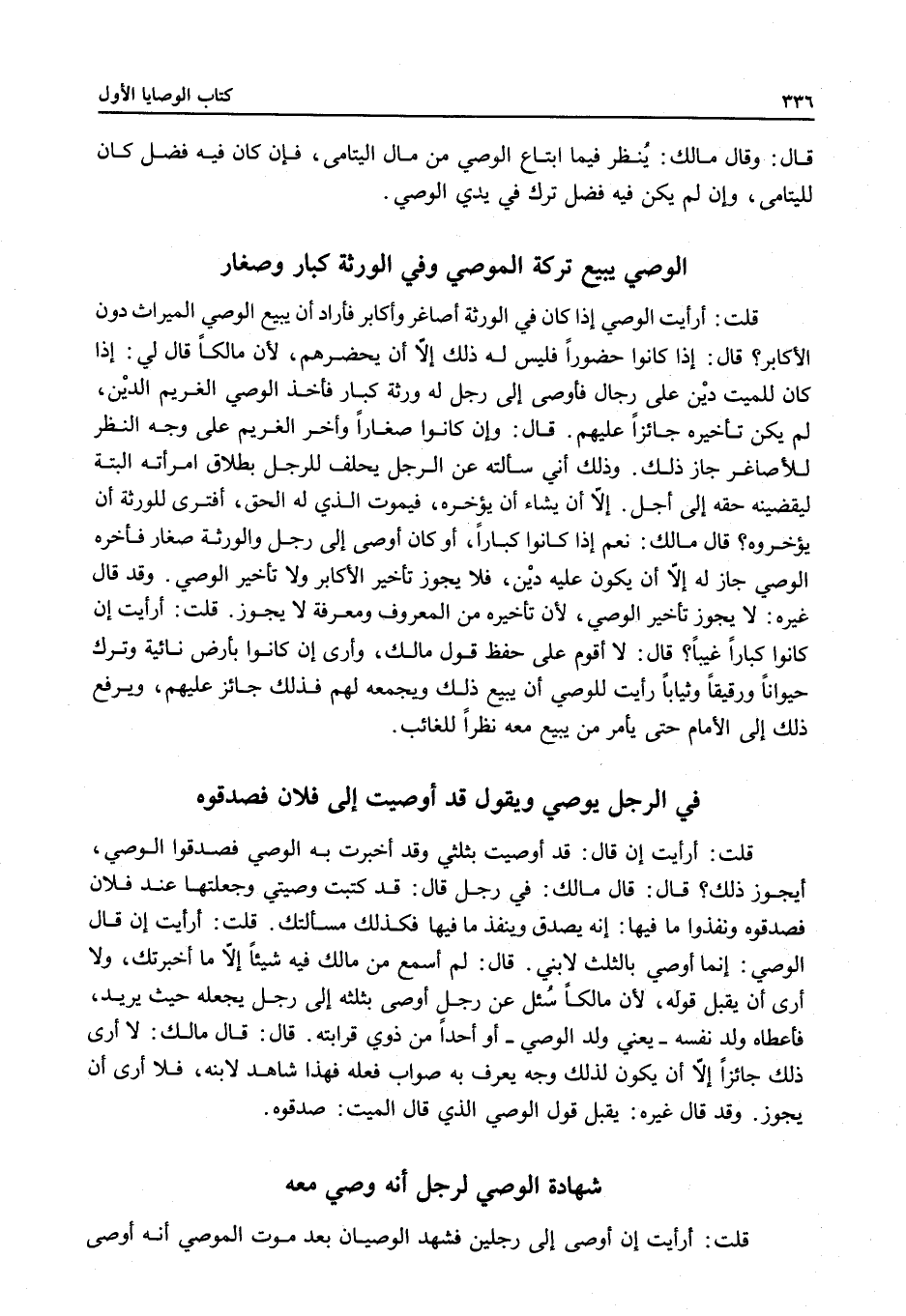 ٌ قُلْتُ: أَرَأَيْتَ الْوَصِيَّ إذَا كَانَ فِي الْوَرَثَةِ أَصَاغِرُ وَأَكَابِرُ فَأَرَادَ أَنْ يَبِيعَ الْوَصِيُّ الْمِيرَاثَ دُونَ الْأَكَابِرِ؟
