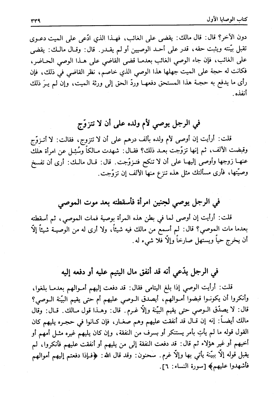 َ قُلْتُ: أَرَأَيْتَ إنْ أَوْصَى لِأُمِّ وَلَدِهِ بِأَلْفِ دِرْهَمٍ عَلَى أَنْ لَا تَتَزَوَّجَ، فَقَالَتْ: لَا أَتَزَوَّجُ وَقَبَضَتْ الْأَلْفَ، ثُمَّ إنَّهَا تَزَوَّجَتْ بَعْدَ ذَلِكَ؟ فَقَالَ: شَهِدْتُ مَالِكًا وَسُئِلَ عَنْ امْرَأَةٍ هَلَكَ عَنْهَا زَوْجُهَا وَأَوْصَى إلَيْهَا عَلَى أَنْ لَا تَنْكِحَ فَتَزَوَّجَتْ. قَالَ: قَالَ مَالِكٌ: أَرَى أَنْ تَفْسَخَ وَصِيَّتَهَا، فَأَرَى مَسْأَلَتَكَ مِثْلَ هَذِهِ تَنْزِعُ مِنْهَا الْأَلْفَ إنْ تَزَوَّجَتْ.