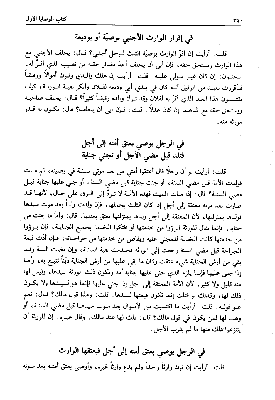 ً قُلْتُ: أَرَأَيْتَ لَوْ أَنَّ رَجُلًا قَالَ أَعْتِقُوا أَمَتِي مِنْ بَعْدِ مَوْتِي بِسَنَةٍ فِي وَصِيَّتِهِ، ثُمَّ مَاتَ فَوَلَدَتْ الْأَمَةُ قَبْلَ مُضِيِّ السَّنَةِ، أَوْ جَنَتْ جِنَايَةً قَبْلَ مُضِيِّ السَّنَةِ، أَوْ جُنِيَ عَلَيْهَا جِنَايَةٌ قَبْلَ مُضِيِّ السَّنَةِ؟