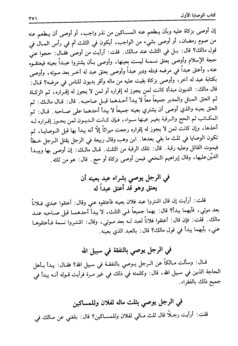 ِ قَالَ: وَسَأَلْتُ مَالِكًا عَنْ الرَّجُلِ يُوصِي بِالنَّفَقَةِ فِي سَبِيلِ اللَّهِ؟ فَقَالَ: يُبْدَأُ بِأَهْلِ الْحَاجَةِ الَّذِينَ فِي سَبِيلِ اللَّهِ، قَالَ: وَكَلَّمْتُهُ فِي ذَلِكَ فِي غَيْرِ مَرَّةٍ فَرَأَيْتُ قَوْلَهُ أَنَّهُ يُبْدَأُ فِي جَمِيعِ ذَلِكَ بِالْفُقَرَاءِ.