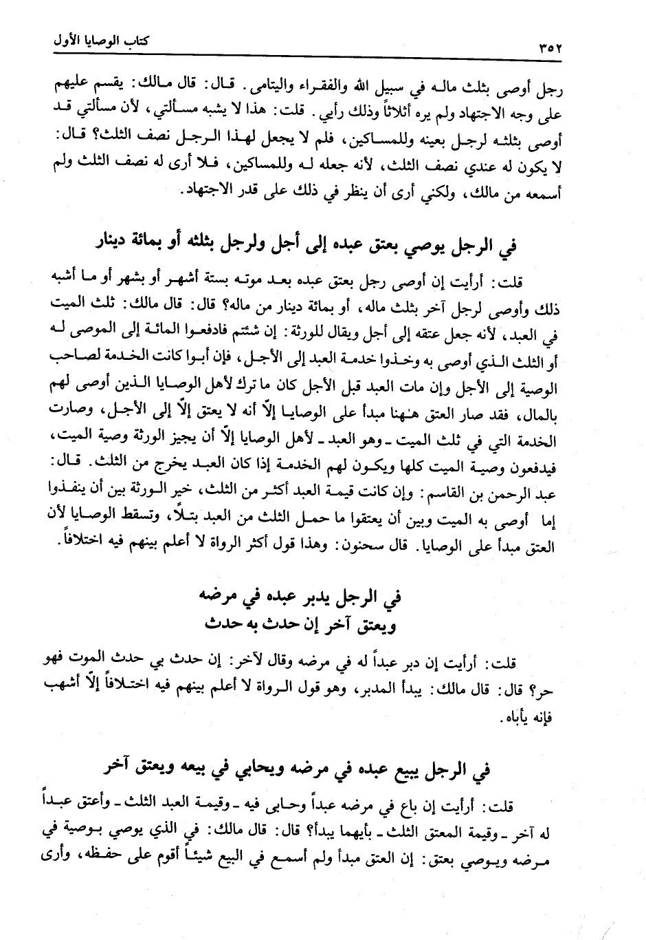 ٍ قُلْتُ: أَرَأَيْتَ إنْ أَوْصَى رَجُلٌ بِعِتْقِ عَبْدِهِ بَعْدَ مَوْتِهِ بِسِتَّةِ أَشْهُرٍ أَوْ بِشَهْرٍ أَوْ مَا أَشْبَهَ ذَلِكَ وَأَوْصَى لِرَجُلٍ آخَرَ بِثُلُثِ مَالِهِ، أَوْ بِمِائَةِ دِينَارٍ مِنْ مَالِهِ؟