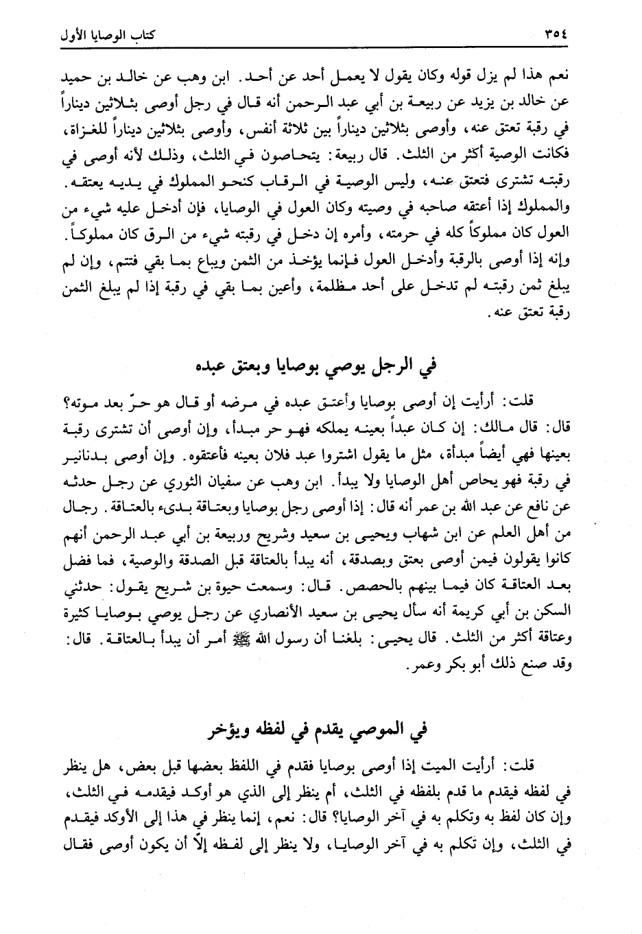 قَالَ: قَالَ مَالِكٌ: إنْ كَانَ عَبْدًا بِعَيْنِهِ يَمْلِكُهُ فَهُوَ حُرٌّ مُبْدَأٌ، وَإِنْ أَوْصَى أَنْ تُشْتَرَى رَقَبَةٌ بِعَيْنِهَا فَهِيَ أَيْضًا مُبْدَأَةٌ، مِثْلُ مَا يَقُولُ اشْتَرُوا عَبْدَ فُلَانٍ بِعَيْنِهِ فَأَعْتِقُوهُ. وَإِنْ أَوْصَى بِدَنَانِيرَ فِي رَقَبَةٍ فَهُوَ يُحَاصُّ أَهْلَ الْوَصَايَا وَلَا يُبْدَأُ. ابْنُ وَهْبٍ عَنْ سُفْيَانَ الثَّوْرِيِّ عَنْ رَجُلٍ حَدَّثَهُ عَنْ نَافِعٍ عَنْ عَبْدِ اللَّهِ بْنِ عُمَرَ أَنَّهُ قَالَ: إذَا أَوْصَى رَجُلٌ بِوَصَايَا وَبِعَتَاقَةٍ بُدِئَ بِالْعَتَاقَةِ. رِجَالٌ مِنْ أَهْلِ الْعِلْمِ عَنْ ابْنِ شِهَابٍ وَيَحْيَى بْنِ سَعِيدٍ وَشُرَيْحٍ وَرَبِيعَةَ بْنِ أَبِي عَبْدِ الرَّحْمَنِ أَنَّهُمْ كَانُوا يَقُولُونَ فِيمَنْ أَوْصَى بِعِتْقٍ وَبِصَدَقَةٍ، أَنَّهُ يُبْدَأُ بِالْعَتَاقَةِ قَبْلَ الصَّدَقَةِ وَالْوَصِيَّةِ، فَمَا فَضَلَ بَعْدَ الْعَتَاقَةِ كَانَ فِيمَا بَيْنَهُمْ بِالْحِصَصِ. قَالَ: وَسَمِعْتُ حَيْوَةَ بْنَ شُرَيْحٍ يَقُولُ: حَدَّثَنِي السَّكَنُ بْنُ أَبِي كَرِيمَةَ أَنَّهُ سَأَلَ يَحْيَى بْنَ سَعِيدٍ الْأَنْصَارِيَّ عَنْ رَجُلٍ يُوصِي بِوَصَايَا كَثِيرَةٍ وَعَتَاقَةٍ أَكْثَرَ مِنْ الثُّلُثِ.