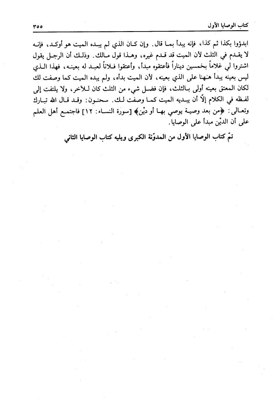 ابْدَءُوا بِكَذَا ثُمَّ كَذَا، فَإِنَّهُ يُبْدَأُ بِمَا قَالَ. وَإِنْ كَانَ الَّذِي لَمْ يُبْدِهِ الْمَيِّتُ هُوَ أَوْكَدُ، فَإِنَّهُ لَا يُقَدَّمُ فِي الثُّلُثِ لِأَنَّ الْمَيِّتَ قَدْ قَدَّمَ غَيْرَهُ، وَهَذَا قَوْلُ مَالِكٍ. وَذَلِكَ أَنَّ الرَّجُلَ يَقُولُ اشْتَرُوا لِي غُلَامًا بِخَمْسِينَ دِينَارًا فَأَعْتِقُوهُ مُبْدَأً وَأَعْتِقُوا فُلَانًا لِعَبْدٍ لَهُ بِعَيْنِهِ، فَهَذَا الَّذِي لَيْسَ بِعَيْنِهِ يُبْدَأُ هَهُنَا عَلَى الَّذِي بِعَيْنِهِ؛ لِأَنَّ الْمَيِّتَ بَدَأَهُ، وَلَوْ لَمْ يُبْدِهِ الْمَيِّتُ كَمَا وَصَفْتُ لَكَ لَكَانَ الْمُعْتَقُ بِعَيْنِهِ أَوْلَى بِالثُّلُثِ، فَإِنْ فَضَلَ شَيْءٌ مِنْ الثُّلُثِ كَانَ لِلْآخَرِ، وَلَا يُلْتَفَتُ إلَى لَفْظِهِ فِي الْكَلَامِ إلَّا أَنْ يُبْدِيَهُ الْمَيِّتُ كَمَا وَصَفْتُ لَكَ. سَحْنُونٌ: وَقَدْ قَالَ اللَّهُ تَبَارَكَ وَتَعَالَى: {مِنْ بَعْدِ وَصِيَّةٍ يُوصَى بِهَا أَوْ دَيْنٍ} [النساء: 12] سُورَةُ النِّسَاءِ فَاجْتَمَعَ أَهْلُ الْعِلْمِ عَلَى أَنَّ الدَّيْنَ مُبْدَأٌ عَلَى الْوَصَايَا تَمَّ كِتَابُ الْوَصَايَا الْأَوَّلُ مِنْ الْمُدَوَّنَةِ الْكُبْرَى وَيَلِيهِ كِتَابُ الْوَصَايَا الثَّانِي