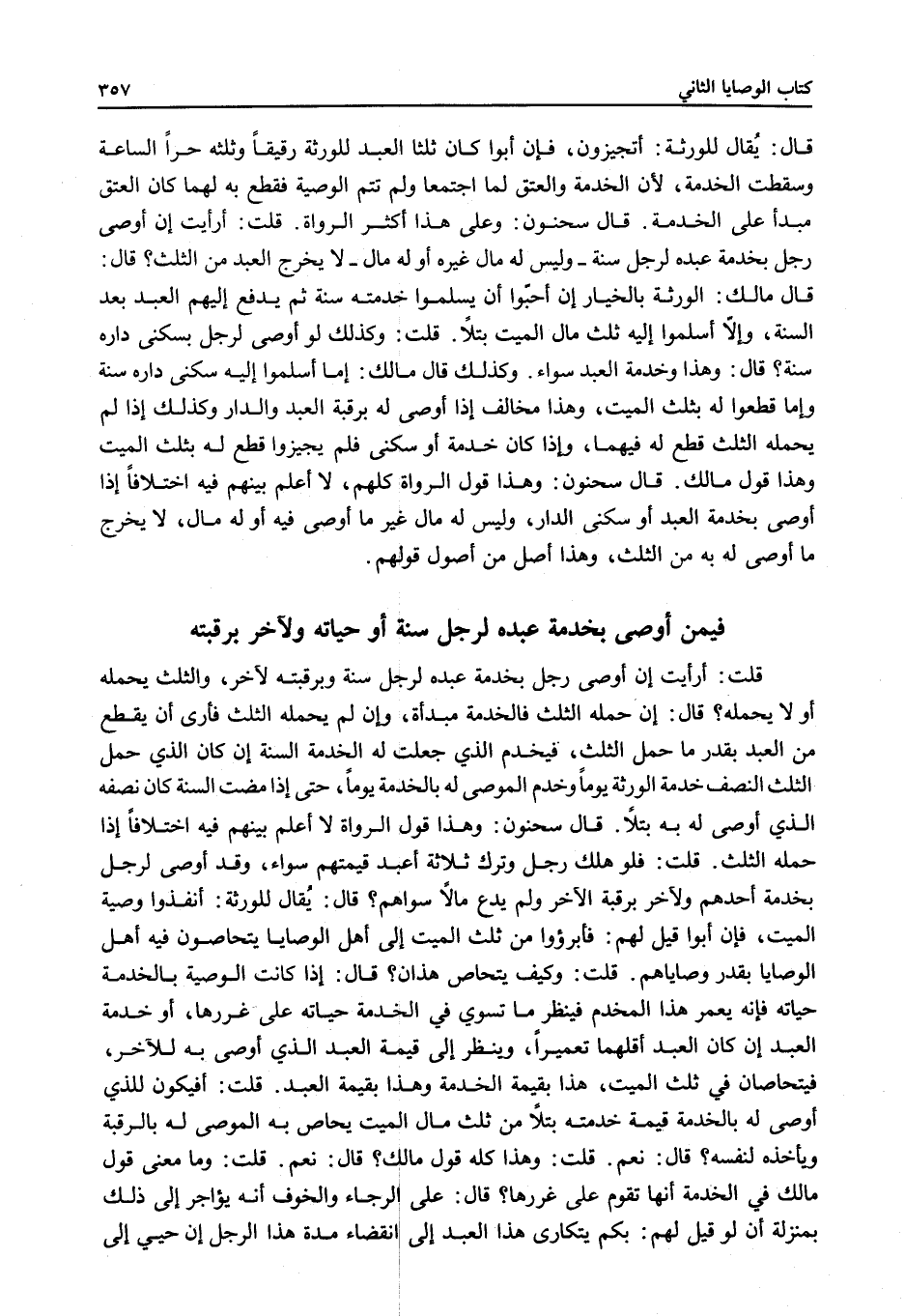 قَالَ: وَهَذَا وَخِدْمَةُ الْعَبْدِ سَوَاءٌ. وَكَذَلِكَ قَالَ مَالِكٌ: إمَّا أَسْلَمُوا إلَيْهِ سُكْنَى دَارِهِ سَنَةً وَإِمَّا قَطَعُوا لَهُ بِثُلُثِ الْمَيِّتِ، وَهَذَا مُخَالِفٌ إذَا أَوْصَى لَهُ بِرَقَبَةِ الْعَبْدِ وَالدَّارِ وَكَذَلِكَ إذَا لَمْ يَحْمِلْهُ الثُّلُثُ قُطِعَ لَهُ فِيهِمَا، وَإِذَا كَانَ خِدْمَةً أَوْ سُكْنَى فَلَمْ يُجِيزُوا قَطْعًا لَهُ بِثُلُثِ الْمَيِّتِ وَهَذَا قَوْلُ مَالِكٍ. قَالَ سَحْنُونٌ. وَهَذَا قَوْلُ الرُّوَاةِ كُلِّهِمْ، لَا أَعْلَمُ بَيْنَهُمْ فِيهِ اخْتِلَافًا إذَا أَوْصَى بِخِدْمَةِ الْعَبْدِ أَوْ سُكْنَى الدَّارِ، وَلَيْسَ لَهُ مَالٌ غَيْرُ مَا أَوْصَى فِيهِ أَوْ لَهُ مَالٌ، لَا يُخْرِجُ مَا أَوْصَى لَهُ بِهِ مِنْ الثُّلُثِ، وَهَذَا أَصْلٌ مِنْ أُصُولِ قَوْلِهِمْ.