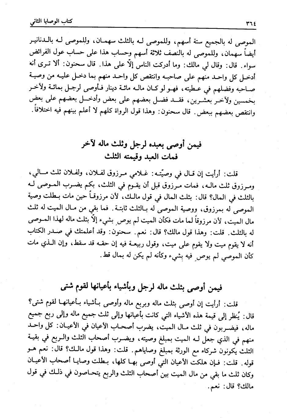 قَالَ سَحْنُونٌ: أَلَا تَرَى أَنَّهُ أَدْخَلَ كُلَّ وَاحِدٍ مِنْهُمْ عَلَى صَاحِبِهِ وَانْتَقَصَ كُلَّ وَاحِدٍ مِنْهُمْ بِمَا دَخَلَ عَلَيْهِ مِنْ وَصِيَّةِ صَاحِبِهِ وَفَضَّلَهُمْ فِي عَطِيَّتِهِ، فَهُوَ لَوْ كَانَ مَالُهُ مِائَةَ دِينَارٍ فَأَوْصَى لِرَجُلٍ بِمِائَةٍ وَلِآخَرَ بِخَمْسِينَ وَلِآخَرَ بِعِشْرِينَ، فَقَدْ فَضَّلَ بَعْضَهُمْ عَلَى بَعْضٍ وَأَدْخَلَ بَعْضَهُمْ عَلَى بَعْضٍ وَانْتَقَصَ بَعْضَهُمْ بِبَعْضٍ.