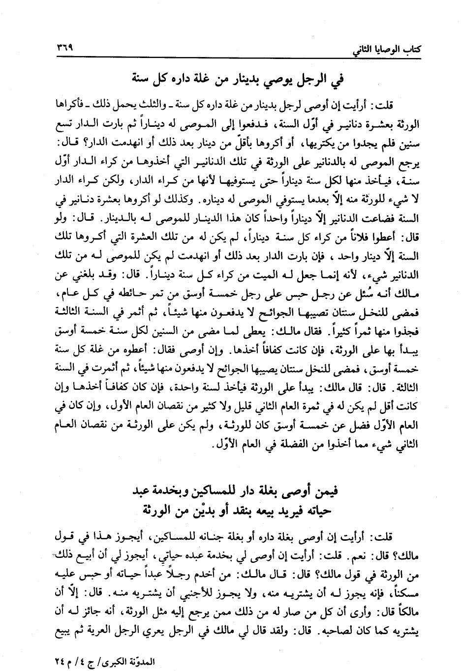 ِ قُلْتُ: أَرَأَيْتَ إنْ أَوْصَى بِغَلَّةِ دَارِهِ أَوْ بِغَلَّةِ جِنَانِهِ لِلْمَسَاكِينِ، أَيَجُوزُ هَذَا فِي قَوْلِ مَالِكٍ؟