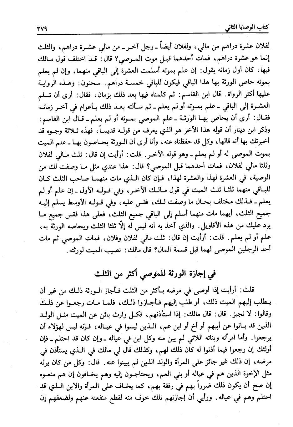 قَالَ ابْنُ الْقَاسِمِ: ثُمَّ كَلَّمْنَاهُ فِيهَا بَعْدَ ذَلِكَ بِزَمَانٍ، فَقَالَ: أَرَى أَنْ تُسَلَّمَ الْعَشَرَةُ إلَى الْبَاقِي - عُلِمَ بِمَوْتِهِ أَوْ لَمْ يُعْلَمْ - ثُمَّ سَأَلْتُهُ بَعْدَ ذَلِكَ بِأَعْوَامٍ فِي آخِرِ زَمَانِهِ فَقَالَ: أَرَى أَنْ يُحَاصَّ بِهَا الْوَرَثَةَ - عَلِمَ الْمُوصِي بِمَوْتِهِ أَوْ لَمْ يَعْلَمْ - قَالَ ابْنُ الْقَاسِمِ: وَذَكَرَ ابْنُ دِينَارٍ أَنَّ قَوْلَهُ هَذَا الْآخَرَ هُوَ الَّذِي يُعْرَفُ مِنْ قَوْلِهِ قَدِيمًا، فَهَذِهِ ثَلَاثَةُ وُجُوهٍ قَدْ أَخْبَرْتُكَ بِهَا أَنَّهُ قَالَهَا، وَكُلٌّ قَدْ حَفِظْنَاهُ عَنْهُ، وَأَنَا أَرَى أَنَّ الْوَرَثَةَ يُحَاصُّونَ بِهَا - عَلِمَ الْمَيِّتُ بِمَوْتِ الْمُوصَى لَهُ أَوْ لَمْ يَعْلَمْ - وَهُوَ قَوْلُهُ الْآخَرُ.
