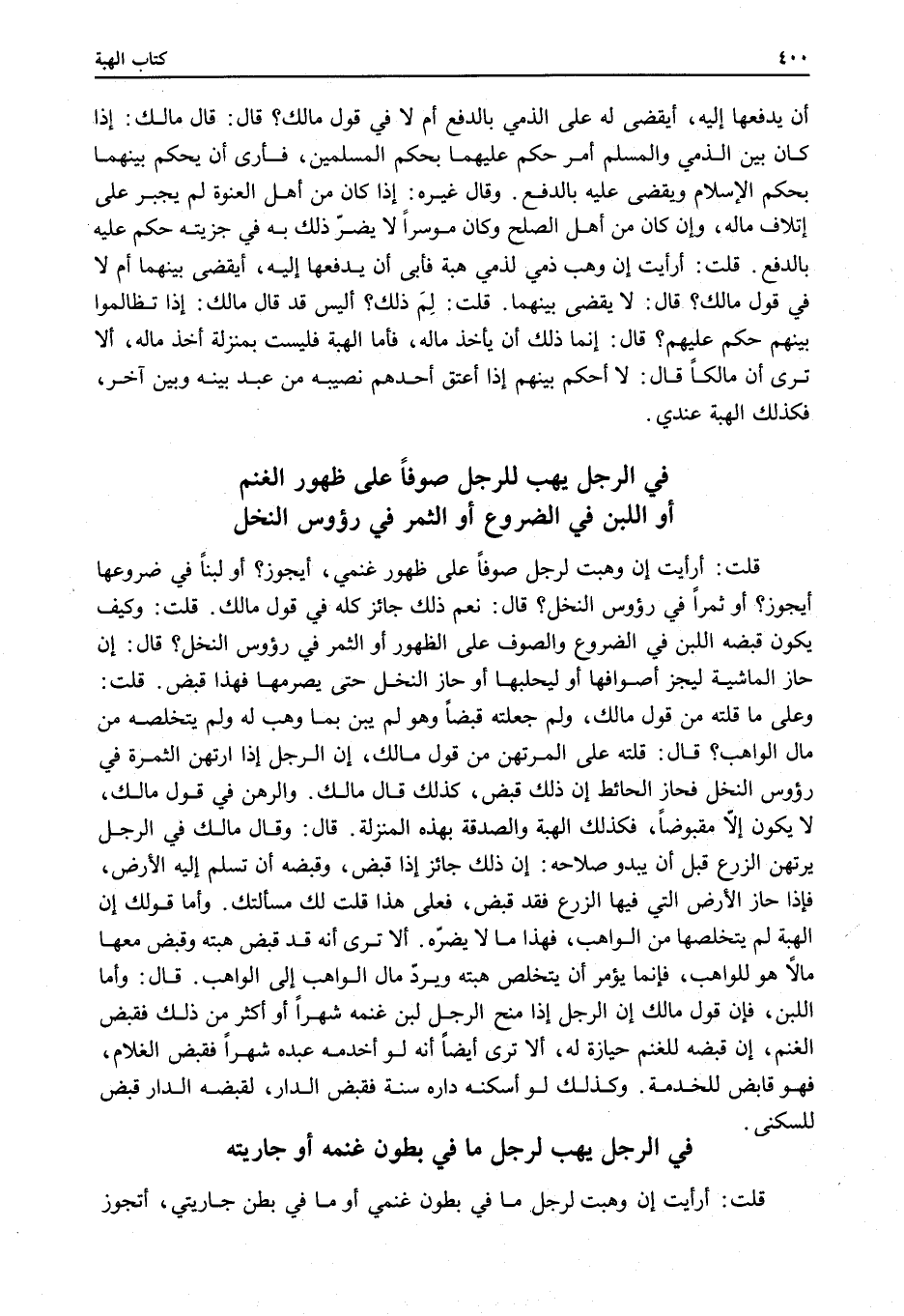 ِ قُلْت: أَرَأَيْت إنْ وَهَبْت لِرَجُلٍ صُوفًا عَلَى ظُهُورِ غَنَمِي، أَيَجُوزُ؟ أَوْ لَبَنًا فِي ضُرُوعِهَا أَيَجُوزُ؟ أَوْ ثَمَرًا فِي رُءُوسِ النَّخْلِ؟ قَالَ: نَعَمْ. ذَلِكَ جَائِزٌ كُلُّهُ فِي قَوْلِ مَالِكٍ. قُلْت: وَكَيْفَ يَكُونُ قَبْضُهُ اللَّبَنَ فِي الضُّرُوعِ وَالصُّوفَ عَلَى الظُّهُورِ أَوْ الثَّمَرَ فِي رُءُوسِ النَّخْلِ؟