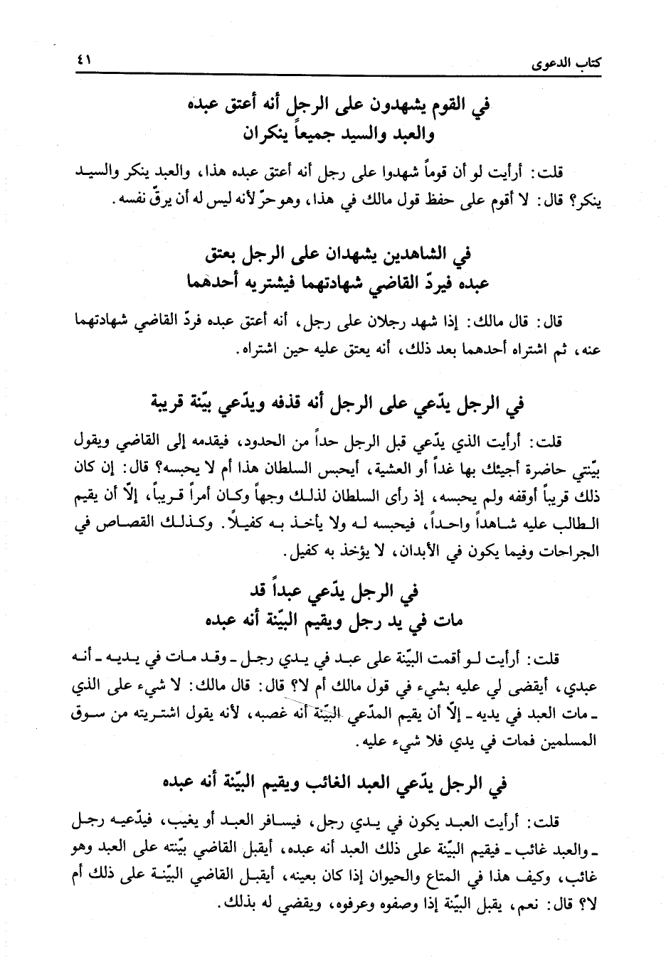 ً قُلْتُ: أَرَأَيْتَ الَّذِي يَدَّعِي قِبَلَ الرَّجُلِ حَدًّا مِنْ الْحُدُودِ، فَيُقَدِّمُهُ إلَى الْقَاضِي وَيَقُولُ بَيِّنَتِي حَاضِرَةٌ أَجِيئُك بِهَا غَدًا أَوْ الْعَشِيَّةَ، أَيَحْبِسُ السُّلْطَانُ هَذَا أَمْ لَا يَحْبِسُهُ؟