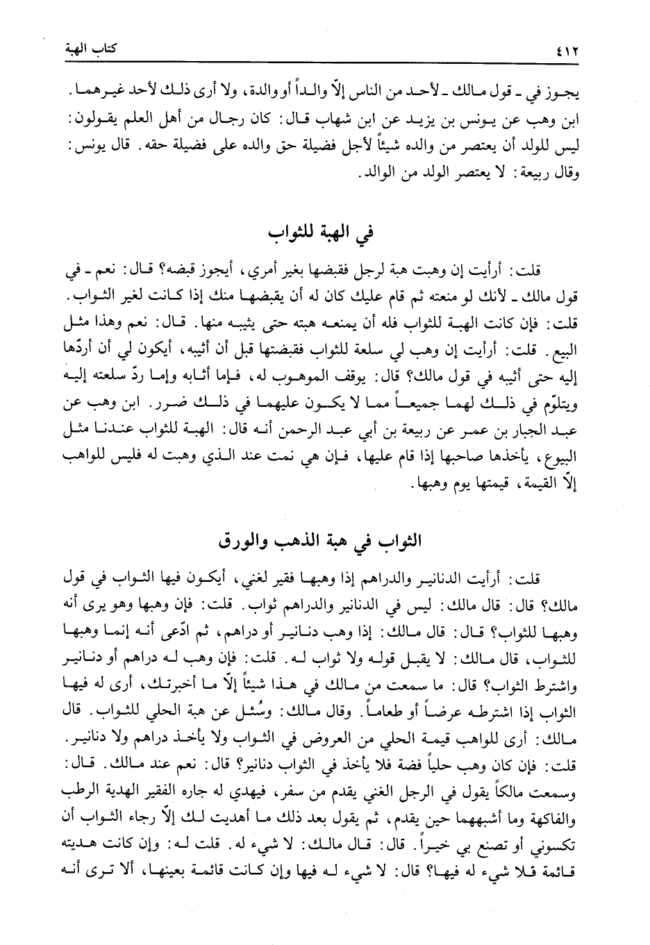 ِ قُلْت: أَرَأَيْت الدَّنَانِيرَ وَالدَّرَاهِمَ إذَا وَهَبَهَا فَقِيرٌ لِغَنِيٍّ، أَيَكُونُ فِيهَا الثَّوَابُ فِي قَوْلِ مَالِكٍ؟ قَالَ: قَالَ مَالِكٌ: لَيْسَ فِي الدَّنَانِيرِ وَالدَّرَاهِمِ ثَوَابٌ. قُلْت: فَإِنْ وَهَبَهَا وَهُوَ يَرَى أَنَّهُ وَهَبَهَا لِلثَّوَابِ؟ قَالَ: قَالَ مَالِكٌ: إذَا وَهَبَ دَنَانِيرَ أَوْ دَرَاهِمَ، ثُمَّ ادَّعَى أَنَّهُ إنَّمَا وَهَبَهَا لِلثَّوَابِ، قَالَ مَالِكٌ: لَا يُقْبَلُ قَوْلُهُ وَلَا ثَوَابَ لَهُ. قُلْت: فَإِنْ وَهَبَ لَهُ دَرَاهِمَ أَوْ دَنَانِيرَ وَاشْتَرَطَ الثَّوَابَ؟ قَالَ: مَا سَمِعْتُ مِنْ مَالِكٍ فِي هَذَا شَيْئًا إلَّا مَا أَخْبَرْتُك، وَأَرَى لَهُ فِيهَا الثَّوَابَ إذَا اشْتَرَطَهُ عَرَضًا أَوْ طَعَامًا وَقَالَ مَالِكٌ: وَسُئِلَ عَنْ هِبَةِ الْحُلِيِّ لِلثَّوَابِ قَالَ مَالِكٌ: أَرَى لِلْوَاهِبِ قِيمَةَ الْحُلِيِّ مِنْ الْعُرُوضِ فِي الثَّوَابِ وَلَا يَأْخُذُ دَرَاهِمَ وَلَا دَنَانِيرَ.
