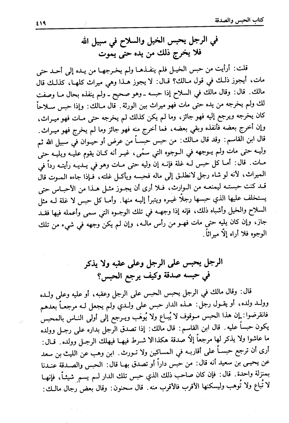 قَالَ ابْنُ الْقَاسِمِ: وَقَدْ قَالَ مَالِكٌ: مَنْ حَبَسَ حَبْسًا مِنْ عَرَضٍ أَوْ حَيَوَانٍ فِي سَبِيلِ اللَّهِ ثُمَّ وَلِيَهُ حَتَّى مَاتَ وَلَمْ يُوَجِّهْهُ فِي الْوُجُوهِ الَّتِي سَمَّى، غَيْرَ أَنَّهُ كَانَ يَقُومُ عَلَيْهِ وَيَلِيهِ حَتَّى مَاتَ. قَالَ: أَمَّا كُلُّ حَبْسٍ لَهُ غَلَّةٌ فَإِنَّهُ إنْ وَلِيَهُ حَتَّى مَاتَ وَهُوَ فِي يَدَيْهِ رَأَيْتُهُ رَدًّا فِي الْمِيرَاثِ؛ لِأَنَّهُ لَوْ شَاءَ رَجُلٌ لَانْطَلَقَ إلَى مَالِهِ فَحَبَسَهُ وَيَأْكُلُ غَلَّتَهُ، فَإِذَا جَاءَهُ الْمَوْتُ قَالَ قَدْ كُنْتُ حَبَسْتُهُ لِيَمْنَعَهُ مِنْ الْوَارِثِ، فَلَا أَرَى أَنْ يَجُوزَ مِثْلُ هَذَا مِنْ الْأَحْبَاسِ حَتَّى يَسْتَخْلِفَ عَلَيْهَا الَّذِي حَبَسَهَا رَجُلًا غَيْرَهُ وَيَتَبَرَّأَ إلَيْهِ مِنْهَا. وَأَمَّا كُلُّ حَبْسٍ لَا غَلَّةَ لَهُ مِثْلُ السِّلَاحِ وَالْخَيْلِ وَأَشْبَاهِ ذَلِكَ، فَإِنَّهُ إذَا وَجَّهَهُ فِي تِلْكَ الْوُجُوهِ الَّتِي سَمَّى وَأَعْمَلَهُ فِيهَا فَقَدْ جَازَ، وَإِنْ كَانَ يَلِيهِ حَتَّى مَاتَ فَهُوَ مِنْ رَأْسِ مَالِهِ، وَإِنْ لَمْ يَكُنْ وَجَّهَهُ فِي شَيْءٍ مِنْ تِلْكَ الْوُجُوهِ فَلَا أَرَاهُ إلَّا مِيرَاثًا.