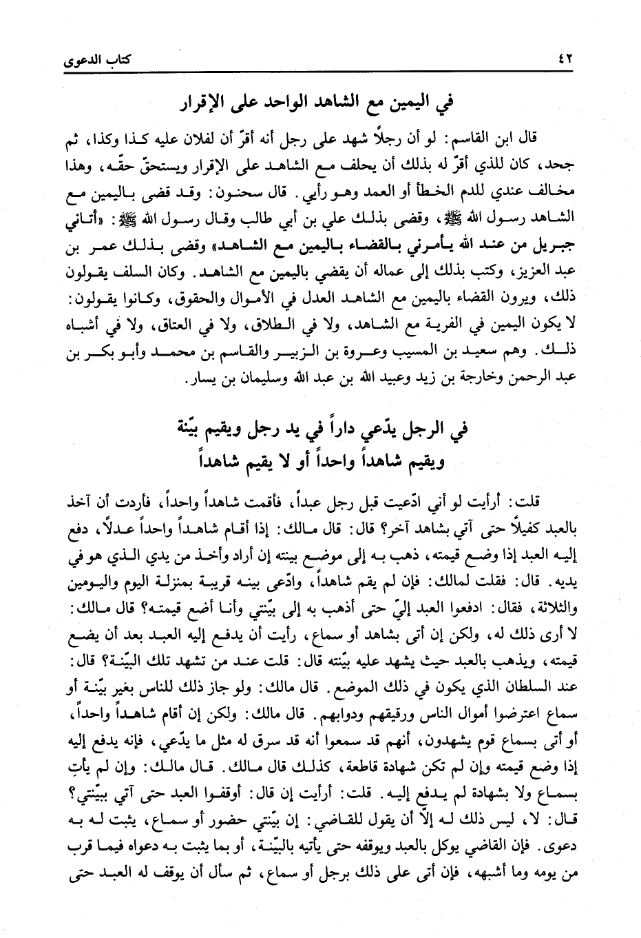 قَالَ سَحْنُونٌ: وَقَدْ قَضَى بِالْيَمِينِ مَعَ الشَّاهِدِ رَسُولُ اللَّهِ - صَلَّى اللَّهُ عَلَيْهِ وَسَلَّمَ -، وَقَضَى بِذَلِكَ عَلِيُّ بْنُ أَبِي طَالِبٍ وَقَالَ رَسُولُ اللَّهِ - صَلَّى اللَّهُ عَلَيْهِ وَسَلَّمَ -: «أَتَانِي جِبْرِيلُ مِنْ عِنْدِ اللَّهِ يَأْمُرنِي بِالْقَضَاءِ بِالْيَمِينِ مَعَ الشَّاهِدِ» وَقَضَى بِذَلِكَ عُمَرُ بْنُ عَبْدِ الْعَزِيزِ، وَكَتَبَ بِذَلِكَ إلَى عُمَّالِهِ أَنْ يَقْضِيَ بِالْيَمِينِ مَعَ الشَّاهِدِ. وَكَانَ السَّلَفُ يَقُولُونَ ذَلِكَ، وَيَرَوْنَ الْقَضَاءَ بِالْيَمِينِ مَعَ الشَّاهِدِ الْعَدْلِ فِي الْأَمْوَالِ وَالْحُقُوقِ، وَكَانُوا يَقُولُونَ: لَا يَكُونُ الْيَمِينُ فِي الْفِرْيَةِ مَعَ الشَّاهِدِ، وَلَا فِي الطَّلَاقِ، وَلَا فِي الْعَتَاقِ، وَلَا فِي أَشْبَاهِ ذَلِكَ. وَهُمْ سَعِيدُ بْنُ الْمُسَيِّبِ وَعُرْوَةُ بْنُ الزُّبَيْرِ وَالْقَاسِمُ بْنُ مُحَمَّدٍ وَأَبُو بَكْرِ بْنُ عَبْدِ الرَّحْمَنِ وَخَارِجَةُ بْنُ زَيْدٍ وَعُبَيْدُ اللَّهِ بْنُ عَبْدِ اللَّهِ وَسُلَيْمَانُ بْنُ يَسَارٍ.