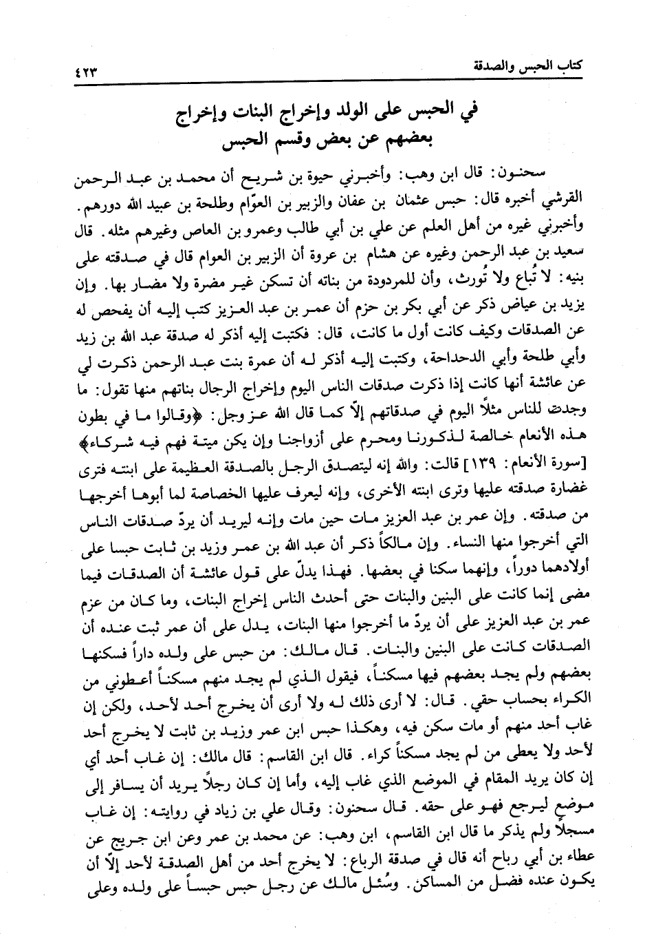 فِي الْحَبْسِ عَلَى الْوَلَدِ وَإِخْرَاجِ الْبَنَاتِ وَإِخْرَاجِ بَعْضِهِمْ عَنْ بَعْضٍ وَقَسْمِ الْحَبْسِ سَحْنُونٌ: قَالَ ابْنُ وَهْبٍ: وَأَخْبَرَنِي حَيْوَةُ بْنُ شُرَيْحٍ أَنَّ مُحَمَّدَ بْنَ عَبْدِ الرَّحْمَنِ الْقُرَشِيَّ أَخْبَرَهُ قَالَ: حَبَسَ عُثْمَانُ بْنُ عَفَّانَ وَالزُّبَيْرُ بْنُ الْعَوَّامِ وَطَلْحَةُ بْنُ عُبَيْدِ اللَّهِ دُورَهُمْ. وَأَخْبَرَنِي غَيْرُهُ مِنْ أَهْلِ الْعِلْمِ عَنْ عَلِيِّ بْنِ أَبِي طَالِبٍ وَعَمْرِو بْنِ الْعَاصِ وَغَيْرِهِمْ مِثْلَهُ.