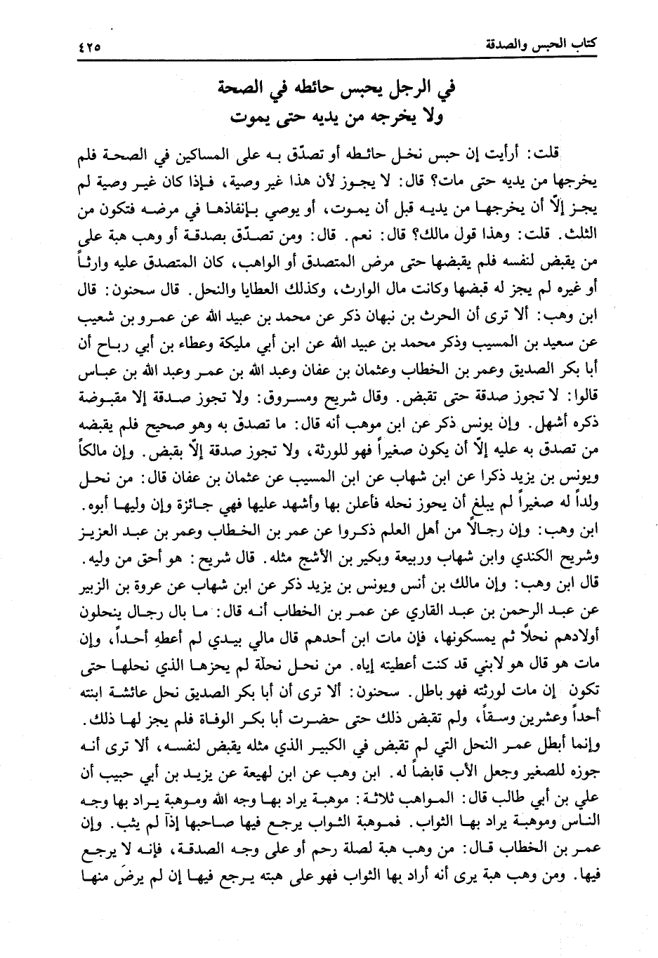 قَالَ سَحْنُونٌ: قَالَ ابْنُ وَهْبٍ: أَلَا تَرَى أَنَّ الْحَارِثَ بْنَ نَبْهَانَ ذَكَرَ عَنْ مُحَمَّدِ بْنِ عُبَيْدِ اللَّهِ عَنْ عَمْرِو بْنِ شُعَيْبٍ عَنْ سَعِيدِ بْنِ الْمُسَيِّبِ وَذَكَرَ مُحَمَّدُ بْنُ عُبَيْدِ اللَّهِ عَنْ ابْنِ أَبِي مُلَيْكَةَ وَعَطَاءِ بْنِ أَبِي رَبَاحٍ أَنَّ أَبَا بَكْرٍ الصِّدِّيقَ وَعُمَرَ بْنَ الْخَطَّابِ وَعُثْمَانَ بْنَ عَفَّانَ وَعَبْدَ اللَّهِ بْنَ عُمَرَ وَعَبْدَ اللَّهِ بْنَ عَبَّاسٍ قَالُوا: لَا تَجُوزُ صَدَقَةٌ حَتَّى تُقْبَضَ.