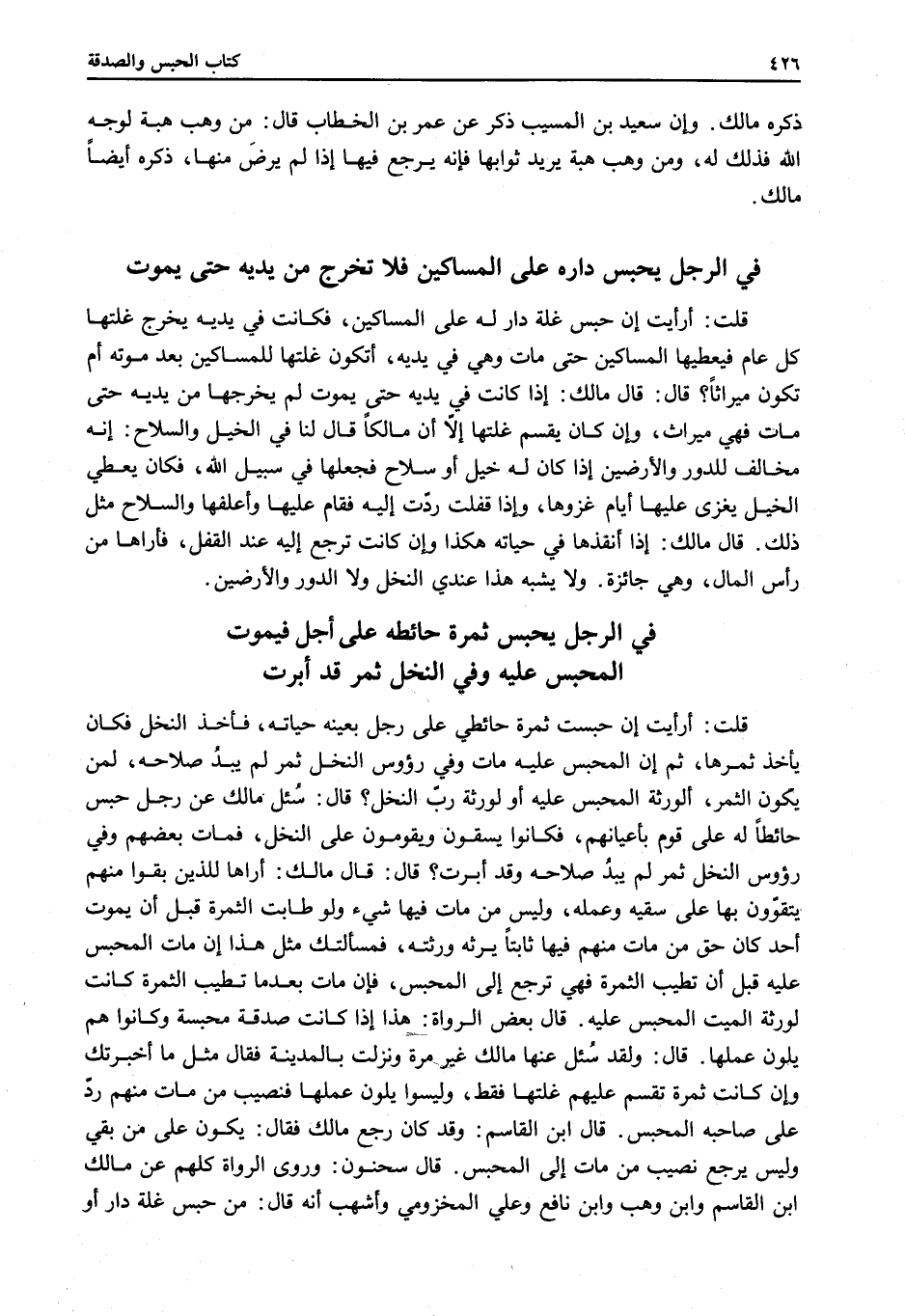 ْ قُلْتُ: أَرَأَيْتَ إنْ حَبَسْت ثَمَرَةَ حَائِطِي عَلَى رَجُلٍ بِعَيْنِهِ حَيَاتَهُ، فَأَخَذَ النَّخْلَ فَكَانَ يَأْخُذُ ثَمَرَهَا، ثُمَّ إنَّ الْمُحْبَسَ عَلَيْهِ مَاتَ وَفِي رُءُوسِ النَّخْلِ ثَمَرٌ لَمْ يَبْدُ صَلَاحُهُ، لِمَنْ يَكُونُ الثَّمَرُ، أَلِوَرَثَةِ الْمُحْبَسِ عَلَيْهِ أَوْ لِوَرَثَةِ رَبِّ النَّخْلِ؟ قَالَ: سُئِلَ مَالِكٌ عَنْ رَجُلٍ حَبَسَ حَائِطًا لَهُ عَلَى قَوْمٍ بِأَعْيَانِهِمْ، فَكَانُوا يَسْقُونَ وَيَقُومُونَ عَلَى النَّخْلِ، فَمَاتَ بَعْضُهُمْ وَفِي رُءُوسِ النَّخْلِ ثَمَرٌ لَمْ يَبْدُ صَلَاحُهُ وَقَدْ أُبِّرَتْ؟ قَالَ: قَالَ مَالِكٌ: أَرَاهَا لِلَّذِينَ بَقَوْا مِنْهُمْ يَتَقَوَّوْنَ بِهَا عَلَى سَقْيِهِ وَعَمَلِهِ، وَلَيْسَ مَنْ مَاتَ فِيهَا شَيْءٌ وَلَوْ طَابَتْ الثَّمَرَةُ قَبْلَ أَنْ يَمُوتَ أَحَدٌ كَانَ حَقُّ مَنْ مَاتَ مِنْهُمْ فِيهَا ثَابِتًا يَرِثُهُ وَرَثَتُهُ، فَمَسْأَلَتُكَ مِثْلُ هَذَا إنْ مَاتَ الْمُحْبَسُ عَلَيْهِ قَبْلَ أَنْ تَطِيبَ الثَّمَرَةُ فَهِيَ تَرْجِعُ إلَى الْمُحْبِسِ، فَإِنْ مَاتَ بَعْدَمَا تَطِيبُ الثَّمَرَةُ كَانَتْ لِوَرَثَةِ الْمَيِّتِ الْمُحْبَسِ عَلَيْهِ.