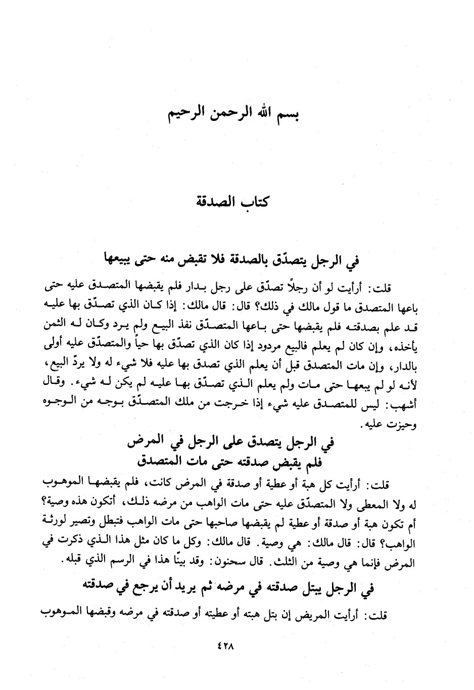 ِ فِي الرَّجُلِ يَتَصَدَّقُ بِالصَّدَقَةِ فَلَا تُقْبَضُ مِنْهُ حَتَّى يَبِيعَهَا قُلْتُ: أَرَأَيْتَ لَوْ أَنَّ رَجُلًا تَصَدَّقَ عَلَى رَجُلٍ بِدَارٍ فَلَمْ يَقْبِضْهَا الْمُتَصَدَّقُ عَلَيْهِ حَتَّى بَاعَهَا الْمُتَصَدِّقُ مَا قَوْلُ مَالِكٍ فِي ذَلِكَ؟