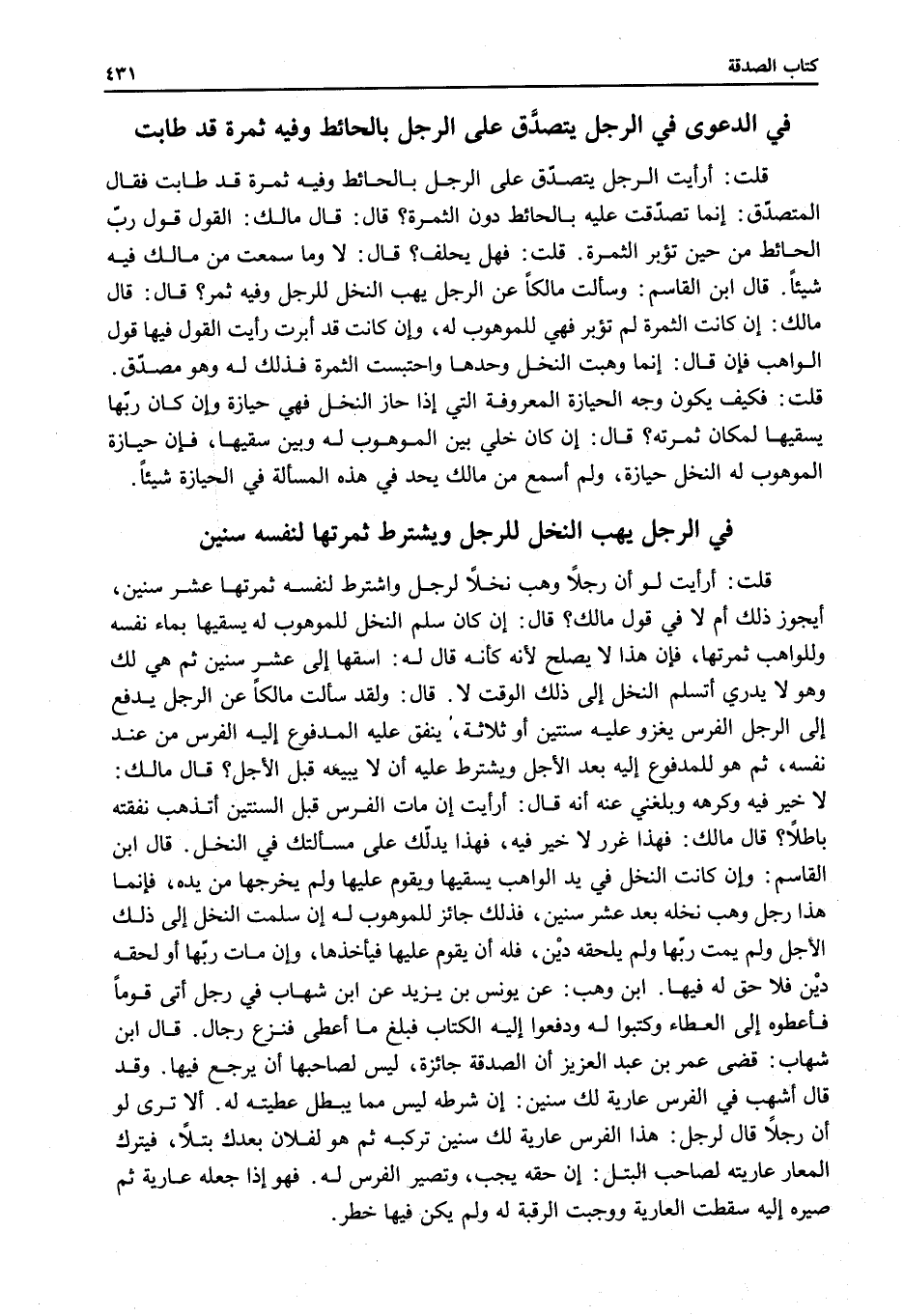 ْ قُلْتُ: أَرَأَيْتَ الرَّجُلَ يَتَصَدَّقُ عَلَى الرَّجُلِ بِالْحَائِطِ وَفِيهِ ثَمَرَةٌ قَدْ طَابَتْ فَقَالَ الْمُتَصَدِّقُ: إنَّمَا تَصَدَّقْتُ عَلَيْهِ بِالْحَائِطِ دُونَ الثَّمَرَةِ؟ قَالَ: قَالَ مَالِكٌ: الْقَوْلُ قَوْلُ رَبِّ الْحَائِطِ مِنْ حِينِ تُؤَبَّرُ الثَّمَرَةُ.