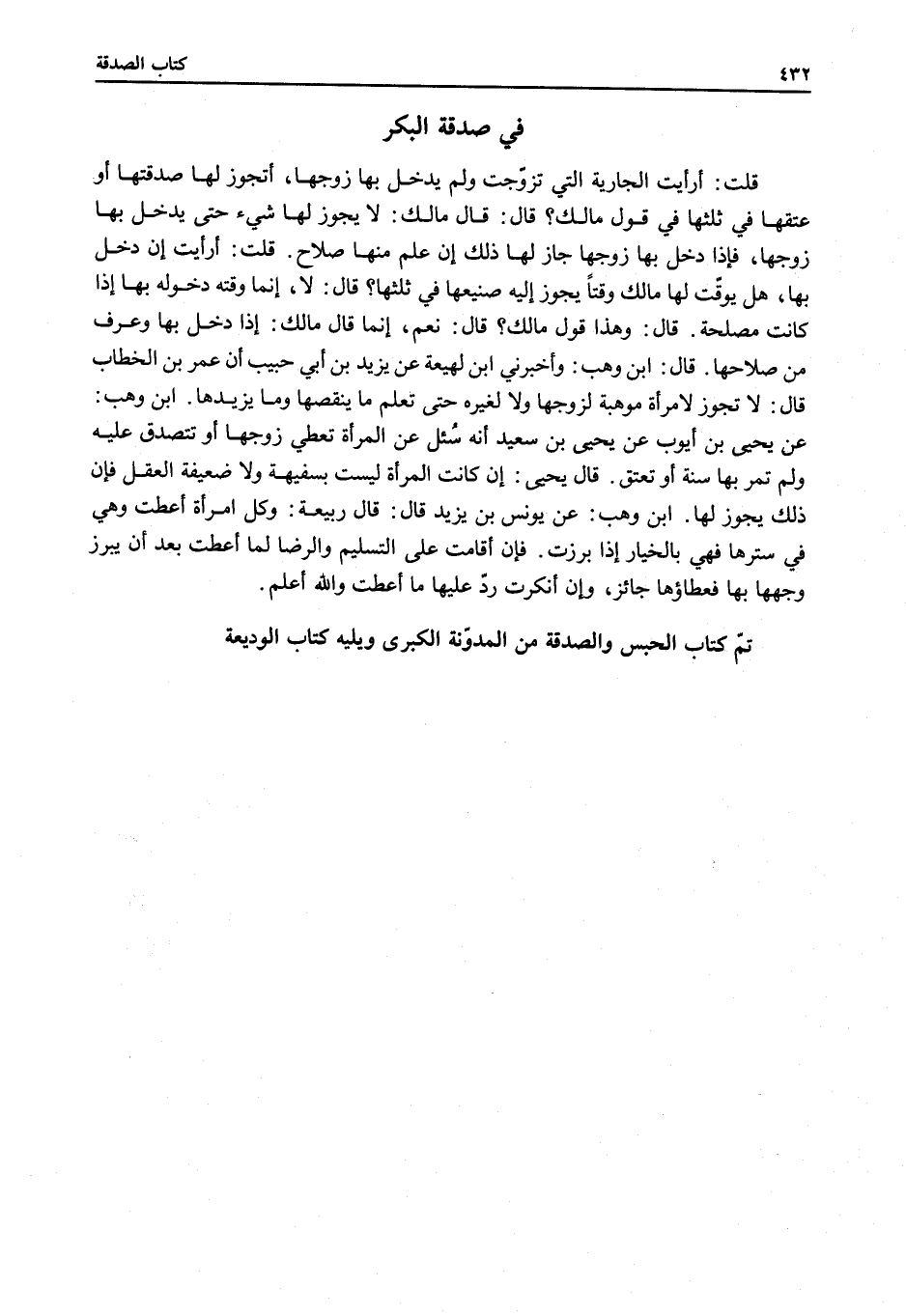 ابْنُ وَهْبٍ: عَنْ يَحْيَى بْنِ أَيُّوبَ عَنْ يَحْيَى بْنِ سَعِيدٍ أَنَّهُ سُئِلَ عَنْ الْمَرْأَةِ تُعْطِي زَوْجَهَا أَوْ تَتَصَدَّقُ عَلَيْهِ وَلَمْ تَمُرَّ بِهَا سَنَةٌ أَوْ تُعْتَقُ. .