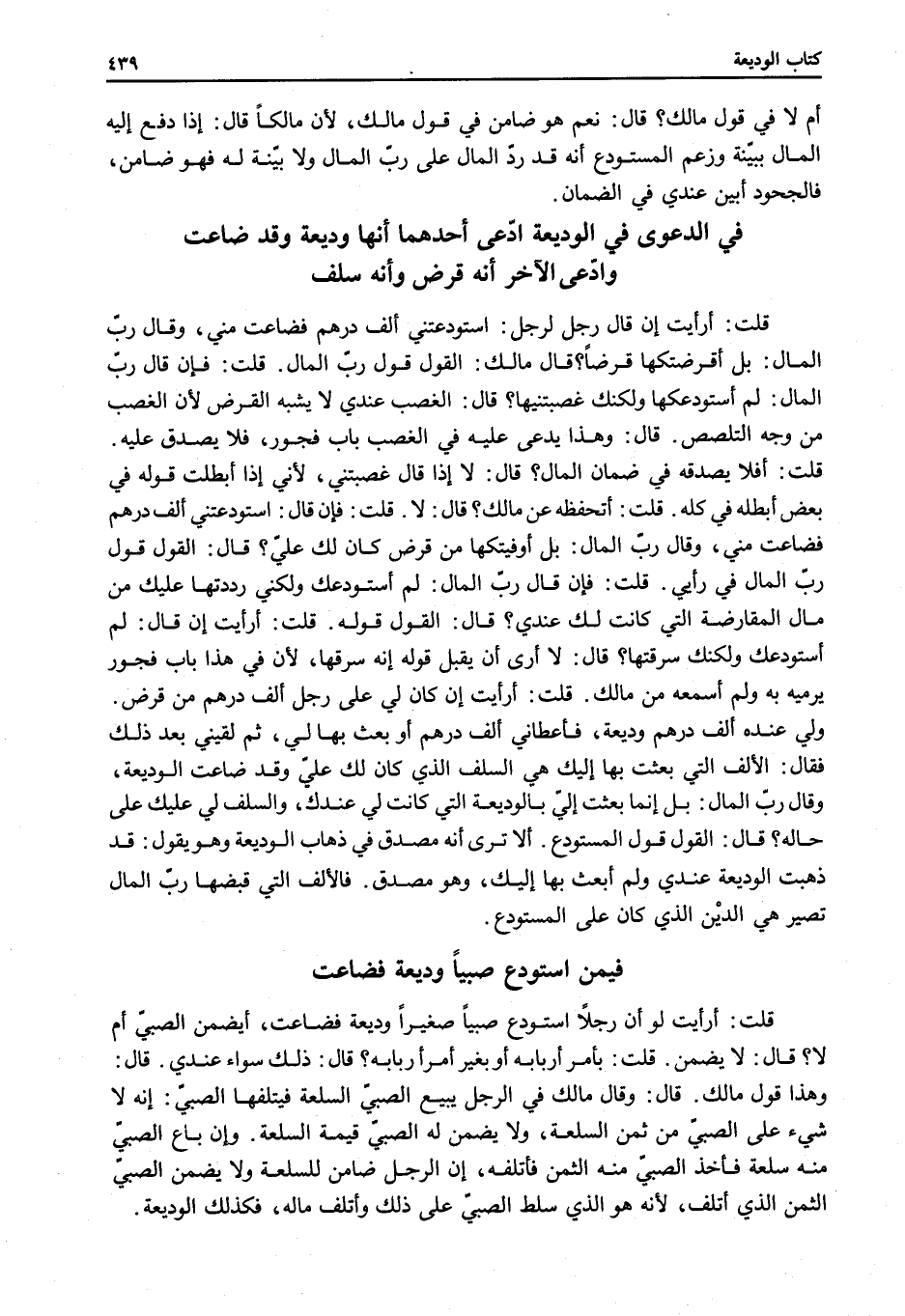 ْ قُلْتُ: أَرَأَيْتَ لَوْ أَنَّ رَجُلًا اسْتَوْدَعَ صَبِيًّا صَغِيرًا وَدِيعَةً فَضَاعَتْ، أَيَضْمَنُ الصَّبِيُّ أَمْ لَا؟ قَالَ: لَا يَضْمَنُ قُلْتُ: بِأَمْرِ أَرْبَابِهِ أَوْ بِغَيْرِ أَمْرِ أَرْبَابِهِ. قَالَ: ذَلِكَ سَوَاءٌ عِنْدِي. قَالَ: وَهَذَا قَوْلُ مَالِكٍ قَالَ: وَقَالَ مَالِكٌ: فِي الرَّجُلِ يَبِيعُ الصَّبِيَّ السِّلْعَةَ فَيُتْلِفُهَا الصَّبِيُّ أَنَّهُ لَا شَيْءَ عَلَى الصَّبِيِّ مِنْ ثَمَنِ السِّلْعَةِ، وَلَا يَضْمَنُ لَهُ الصَّبِيُّ قِيمَةَ السِّلْعَةِ. وَإِنْ بَاعَ الصَّبِيُّ مِنْهُ سِلْعَةً فَأَخَذَ الصَّبِيُّ مِنْهُ الثَّمَنَ فَأَتْلَفَهُ، إنَّ الرَّجُلَ ضَامِنٌ لِلسِّلْعَةِ وَلَا يَضْمَنُ الصَّبِيُّ الثَّمَنَ الَّذِي أَتْلَفَ، لِأَنَّهُ هُوَ الَّذِي سَلَّطَ الصَّبِيَّ عَلَى ذَلِكَ وَأَتْلَفَ مَالَهُ، فَكَذَلِكَ الْوَدِيعَةُ.