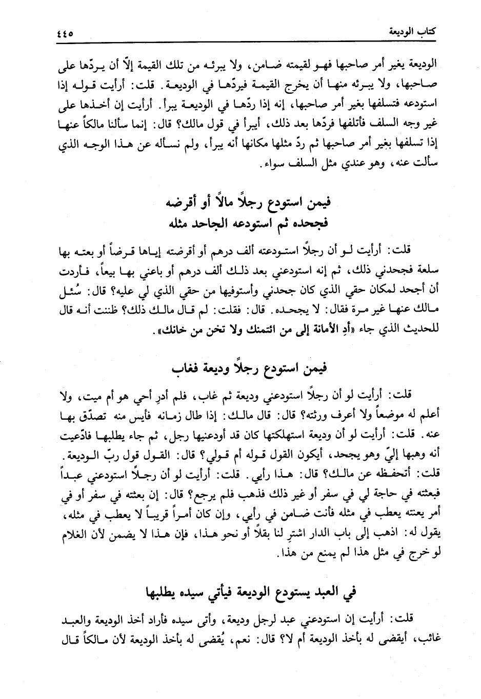 قَالَ: سُئِلَ مَالِكٌ عَنْهَا غَيْرَ مَرَّةٍ فَقَالَ: لَا يَجْحَدُهُ. قَالَ: فَقُلْتُ: لِمَ قَالَ مَالِكٌ ذَلِكَ؟ ظَنَنْتُ أَنَّهُ قَالَ لِلْحَدِيثِ الَّذِي جَاءَ «أَدِّ الْأَمَانَةَ إلَى مَنْ ائْتَمَنَكَ وَلَا تَخُنْ مَنْ خَانَكَ» .
