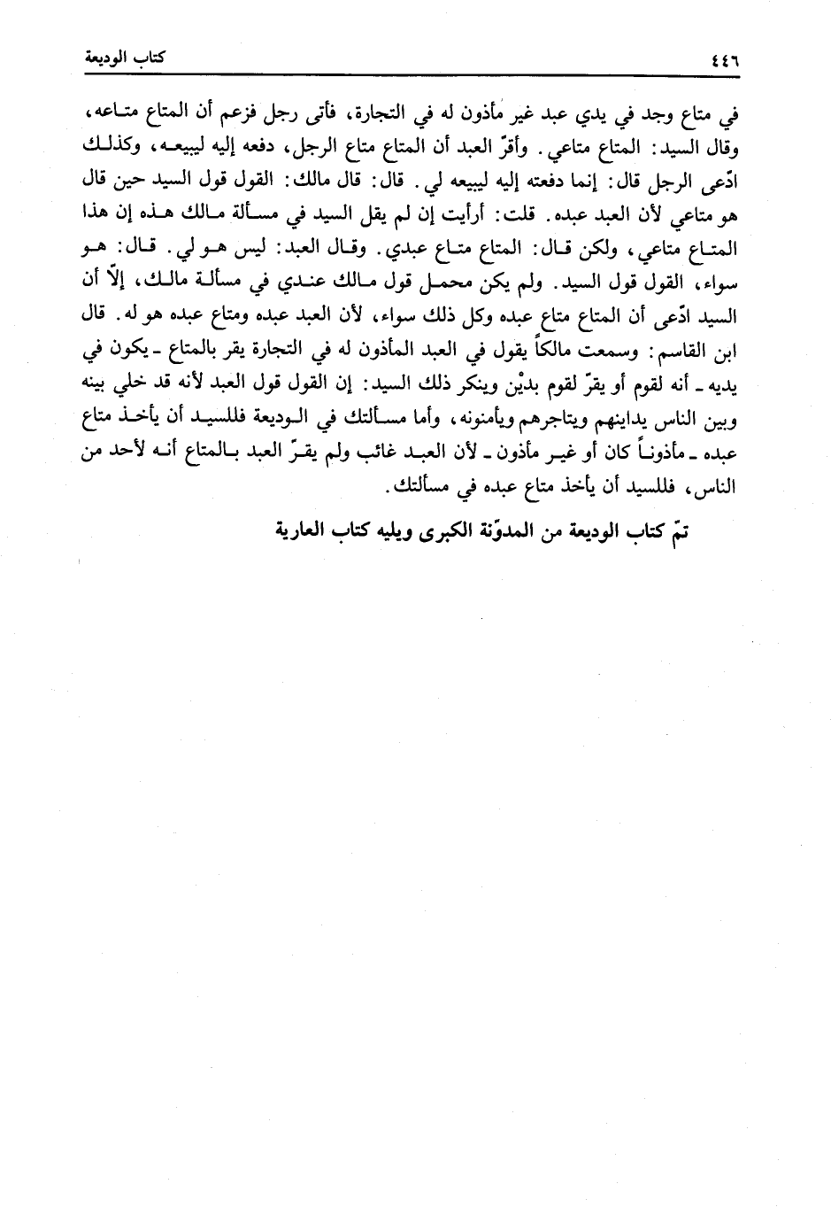 قَالَ ابْنُ الْقَاسِمِ: وَسَمِعْتُ مَالِكًا يَقُولُ فِي الْعَبْدِ الْمَأْذُونِ لَهُ فِي التِّجَارَةِ يُقِرُّ بِالْمَتَاعِ - يَكُونُ فِي يَدَيْهِ - أَنَّهُ لِقَوْمٍ أَوْ يُقِرُّ لِقَوْمٍ بِدَيْنٍ وَيُنْكِرُ ذَلِكَ السَّيِّدُ: أَنَّ الْقَوْلَ قَوْلُ الْعَبْدِ لِأَنَّهُ قَدْ خَلَّى بَيْنَهُ وَبَيْنَ النَّاسِ يُدَايِنُهُمْ وَيُتَاجِرُهُمْ وَيَأْمَنُونَهُ، وَأَمَّا مَسْأَلَتُكَ فِي الْوَدِيعَةِ فَلِلسَّيِّدِ أَنْ يَأْخُذَ مَتَاعَ عَبْدِهِ - مَأْذُونًا كَانَ أَوْ غَيْرَ مَأْذُونٍ - لِأَنَّ الْعَبْدَ غَائِبٌ وَلَمْ يُقِرَّ الْعَبْدُ بِالْمَتَاعِ أَنَّهُ لِأَحَدٍ مِنْ النَّاسِ، فَلِلسَّيِّدِ أَنْ يَأْخُذَ مَتَاعَ عَبْدِهِ فِي مَسْأَلَتِكَ