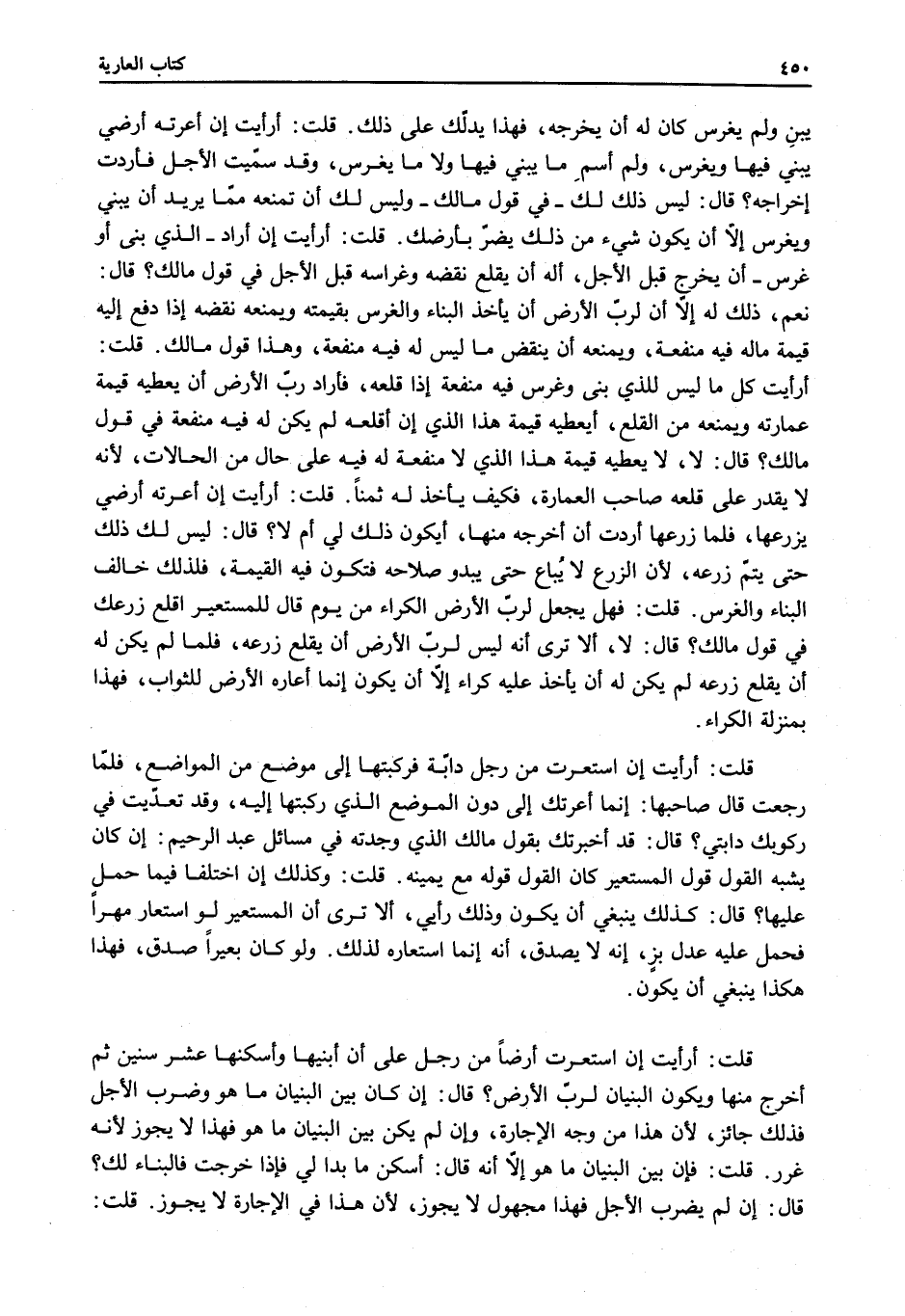 قُلْتُ: أَرَأَيْتَ إنْ اسْتَعَرْت أَرْضًا مِنْ رَجُلٍ عَلَى أَنْ أَبْنِيَهَا وَأَسْكُنَهَا عَشْرَ سِنِينَ ثُمَّ أَخْرُجُ مِنْهَا وَيَكُونُ الْبُنْيَانُ لِرَبِّ الْأَرْضِ؟
