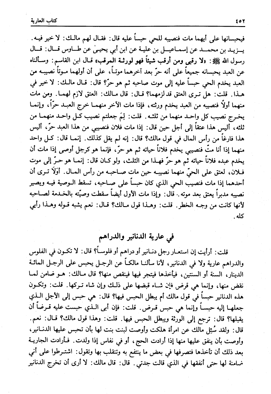 قَالَ لَا تَكُونُ فِي الْفُلُوسِ وَالدَّرَاهِمِ عَارِيَّةٌ وَلَا فِي الدَّنَانِيرِ، لِأَنَّا سَأَلْنَا مَالِكًا عَنْ الرَّجُلِ يَحْبِسُ عَلَى الرَّجُلِ الْمِائَةَ الدِّينَارِ، السَّنَةَ أَوْ السَّنَتَيْنِ، فَيَأْخُذُهَا فَيَتَّجِرُ فِيهَا فَيَنْقُصُ مِنْهَا؟