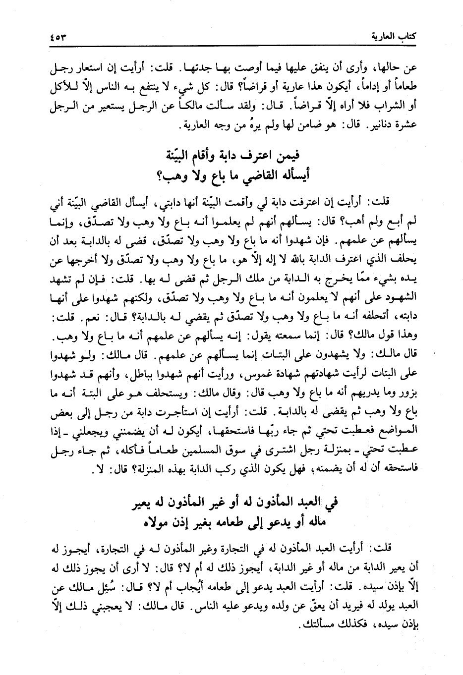 ُ قُلْتُ: أَرَأَيْتَ الْعَبْدَ الْمَأْذُونَ لَهُ فِي التِّجَارَةِ وَغَيْرَ الْمَأْذُونِ لَهُ فِي التِّجَارَةِ، أَيَجُوزُ لَهُ أَنْ يُعِيرَ الدَّابَّةَ مَنْ مَالِهِ أَوْ غَيْرَ الدَّابَّةِ، أَيَجُوزُ ذَلِكَ لَهُ أَمْ لَا؟