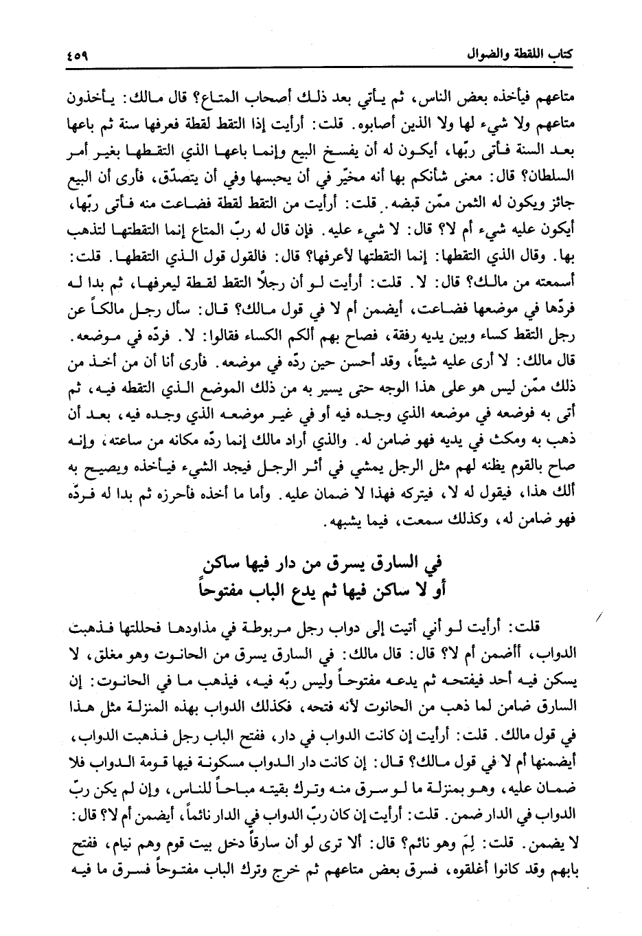 قَالَ: سَأَلَ رَجُلٌ مَالِكًا عَنْ رَجُلٍ الْتَقَطَ كِسَاءً وَبَيْنَ يَدَيْهِ رُفْقَةٌ، فَصَاحَ بِهِمْ أَلْكُمْ الْكِسَاءُ فَقَالُوا: لَا. فَرَدَّهُ فِي مَوْضِعِهِ. قَالَ مَالِكٌ: لَا أَرَى عَلَيْهِ شَيْئًا، وَقَدْ أَحْسَنَ حِينَ رَدَّهُ فِي مَوْضِعِهِ. فَأَرَى أَنَا أَنَّ مَنْ أَخَذَ مِنْ ذَلِكَ مِمَّنْ لَيْسَ هُوَ عَلَى هَذَا الْوَجْهِ حَتَّى يَسِيرَ بِهِ مِنْ ذَلِكَ الْمَوْضِعِ الَّذِي الْتَقَطَهُ فِيهِ، ثُمَّ أَتَى بِهِ فَوَضَعَهُ فِي مَوْضِعِهِ الَّذِي وَجَدَهُ فِيهِ أَوْ فِي غَيْرِ مَوْضِعِهِ الَّذِي وَجَدَهُ فِيهِ، بَعْدَ أَنْ ذَهَبَ بِهِ وَمَكَثَ فِي يَدَيْهِ فَهُوَ ضَامِنٌ لَهُ. وَاَلَّذِي أَرَادَ مَالِكٌ إنَّمَا رَدَّهُ مَكَانَهُ مِنْ سَاعَتِهِ، وَإِنَّهُ صَاحَ بِالْقَوْمِ يَظُنُّهُ لَهُمْ مِثْلُ الرَّجُلِ يَمْشِي فِي أَثَرِ الرَّجُلِ فَيَجِدُ الشَّيْءَ فَيَأْخُذُهُ وَيَصِيحُ بِهِ أَلَكَ هَذَا، فَيَقُولُ لَهُ لَا، فَيَتْرُكُهُ فَهَذَا لَا ضَمَانَ عَلَيْهِ. وَأَمَّا مَا أَخَذَهُ فَأَحْرَزَهُ ثُمَّ بَدَا لَهُ فَرَدَّهُ فَهُوَ ضَامِنٌ لَهُ، وَكَذَلِكَ سَمِعْتُ، فِيمَا يُشْبِهُهُ.