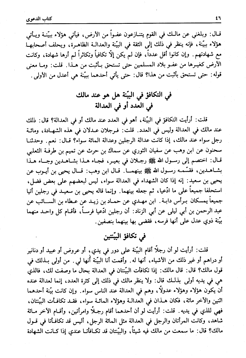 قُلْتُ: أَرَأَيْتَ لَوْ أَنَّ أَحَدَهُمَا أَقَامَ رَجُلًا وَامْرَأَتَيْنِ، وَأَقَامَ الْآخَرُ مِائَةَ شَاهِدٍ، وَكَانَتْ الْمَرْأَتَانِ وَالرَّجُلُ فِي الْعَدَالَةِ مِثْلَ الْمِائَةِ الرَّجُلِ، أَلَيْسَ قَدْ تَكَافَأَتَا فِي قَوْلِ مَالِكٍ؟