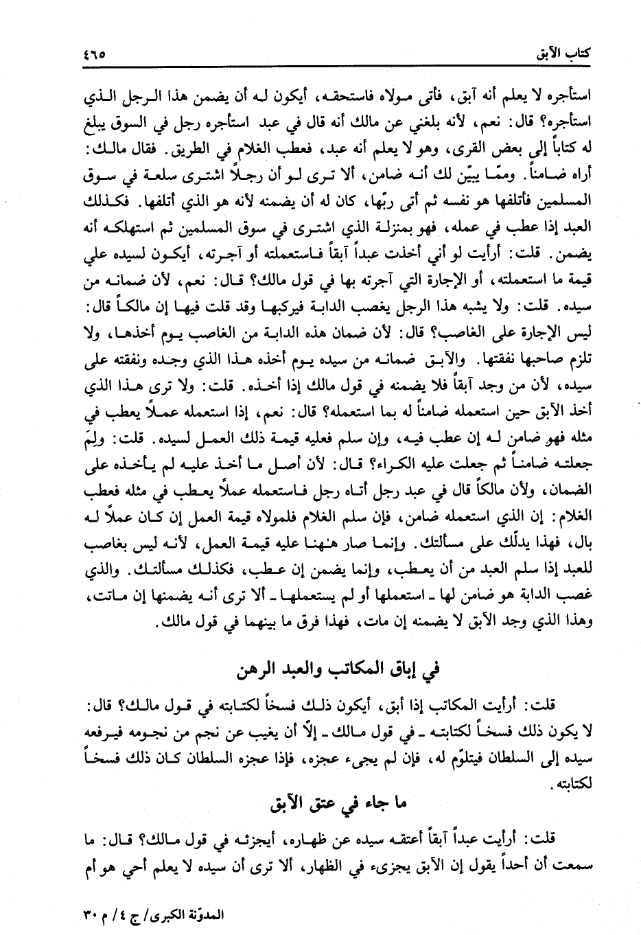 قُلْت: أَرَأَيْت لَوْ أَنِّي أَخَذْت عَبْدًا آبِقًا فَاسْتَعْمَلْته أَوْ آجَرْته، أَيَكُونُ لِسَيِّدِهِ عَلَيَّ قِيمَةِ مَا اسْتَعْمَلْته، أَوْ الْإِجَارَةُ الَّتِي آجَرْته بِهَا فِي قَوْلِ مَالِكٍ؟ قَالَ: نَعَمْ، لِأَنَّ ضَمَانَهُ مِنْ سَيِّدِهِ. قُلْت: وَلَا يُشْبِهُ هَذَا الرَّجُلُ يَغْصِبُ الدَّابَّةَ فَيَرْكَبُهَا وَقَدْ قُلْت فِيهَا إنَّ مَالِكًا قَالَ: لَيْسَ الْإِجَارَةُ عَلَى الْغَاصِبِ؟