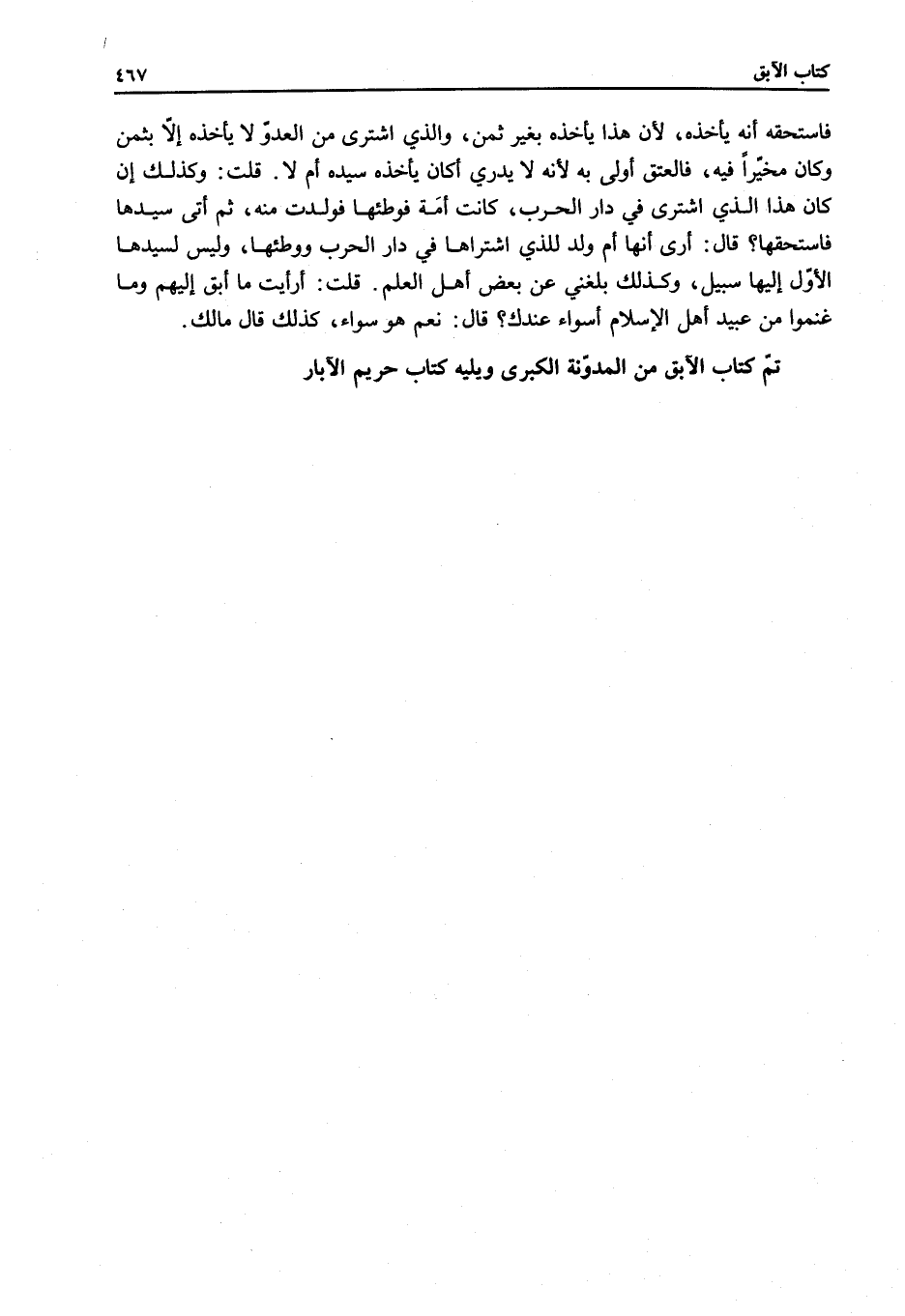فَاسْتَحَقَّهُ أَنَّهُ يَأْخُذُهُ، لِأَنَّ هَذَا يَأْخُذُهُ بِغَيْرِ ثَمَنٍ، وَاَلَّذِي اشْتَرَى مِنْ الْعَدُوِّ لَا يَأْخُذُهُ إلَّا بِثَمَنٍ وَكَانَ مُخَيَّرًا فِيهِ، فَالْعِتْقُ أَوْلَى بِهِ لِأَنَّهُ لَا يَدْرِي أَكَانَ يَأْخُذُهُ سَيِّدُهُ أَمْ لَا. قُلْت: وَكَذَلِكَ إنْ كَانَ هَذَا الَّذِي اشْتَرَى فِي دَارِ الْحَرْبِ، كَانَتْ أَمَةً فَوَطِئَهَا فَوَلَدَتْ مِنْهُ، ثُمَّ أَتَى سَيِّدُهَا فَاسْتَحَقَّهَا؟ قَالَ: أَرَى أَنَّهَا أُمُّ وَلَدٍ لِلَّذِي اشْتَرَاهَا فِي دَارِ الْحَرْبِ وَوَطِئَهَا، وَلَيْسَ لِسَيِّدِهَا الْأَوَّلِ إلَيْهَا سَبِيلٌ، وَكَذَلِكَ بَلَغَنِي عَنْ بَعْضِ أَهْلِ الْعِلْمِ. قُلْت: أَرَأَيْت مَا أَبَقَ إلَيْهِمْ وَمَا غَنِمُوا مِنْ عَبِيدِ أَهْلِ الْإِسْلَامِ أَسَوَاءٌ عِنْدَك؟ قَالَ: نَعَمْ هُوَ سَوَاءٌ، كَذَلِكَ قَالَ مَالِكٌ.
