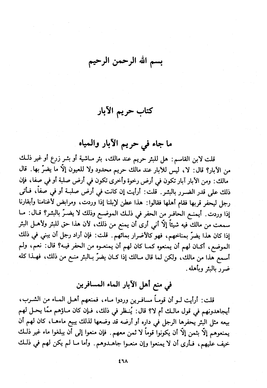 ِ مَا جَاءَ فِي حَرِيمِ الْآبَارِ وَالْمِيَاهِ قُلْت لِابْنِ الْقَاسِمِ: هَلْ لِلْبِئْرِ حَرِيمٌ عِنْدَ مَالِكٍ، بِئْرُ مَاشِيَةٍ أَوْ بِئْرُ زَرْعٍ أَوْ غَيْرُ ذَلِكَ مِنْ الْآبَارِ؟