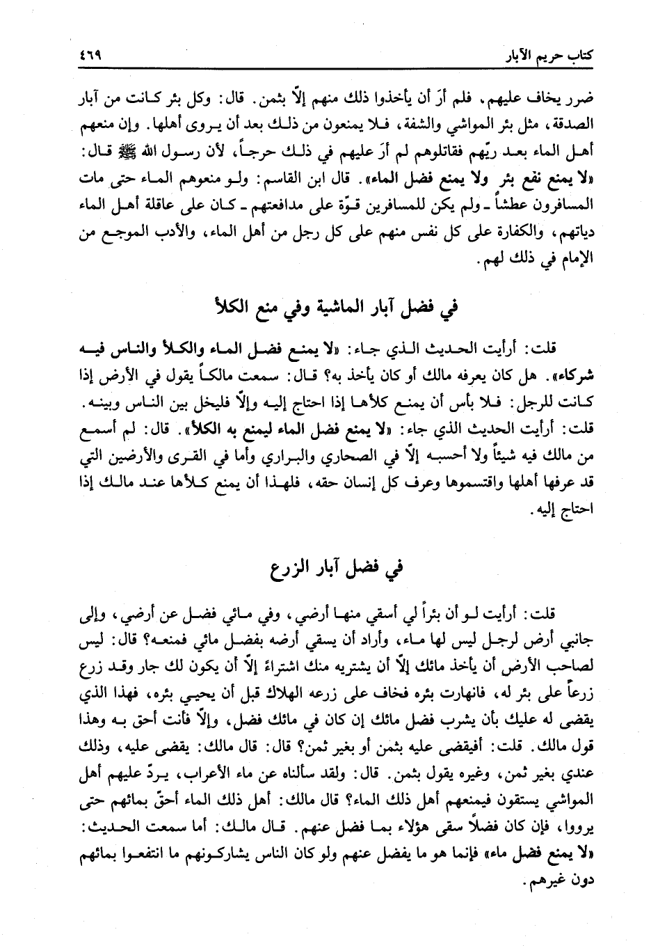 فِي فَضْلِ آبَارٍ الْمَاشِيَةِ وَفِي مَنْعِ الْكَلَأِ قُلْت: أَرَأَيْت الْحَدِيثَ الَّذِي جَاءَ: «لَا يُمْنَعُ فَضْلُ الْمَاءِ وَالْكَلَأِ وَالنَّاسُ فِيهِ شُرَكَاءُ.» هَلْ كَانَ يَعْرِفُهُ مَالِكٌ أَوْ كَانَ يَأْخُذُ بِهِ؟