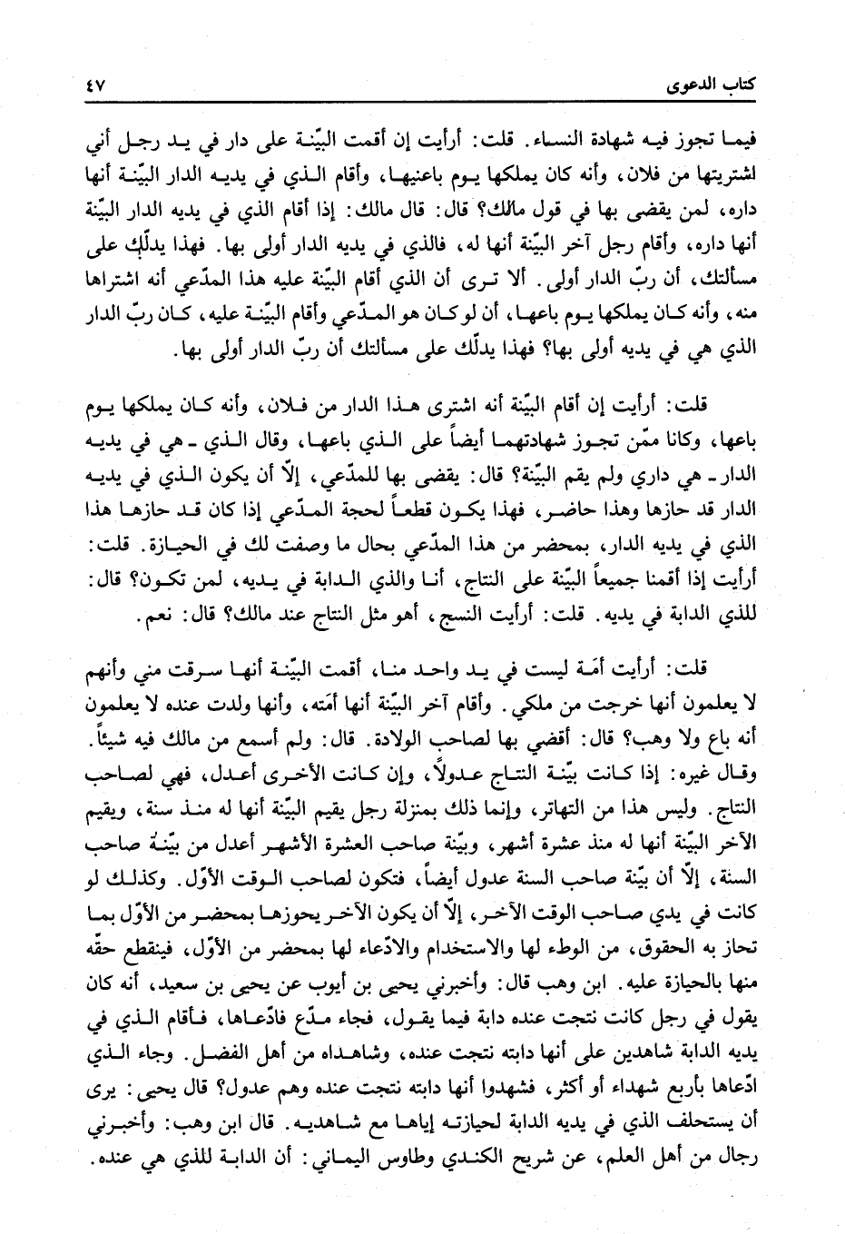 ابْنُ وَهْبٍ قَالَ: وَأَخْبَرَنِي يَحْيَى بْنُ أَيُّوبَ عَنْ يَحْيَى بْنِ سَعِيدٍ أَنَّهُ كَانَ يَقُولُ فِي رَجُلٍ كَانَتْ نُتِجَتْ عِنْدَهُ دَابَّةٌ فِيمَا يَقُولُ، فَجَاءَ مُدَّعٍ فَادَّعَاهَا فَأَقَامَ الَّذِي فِي يَدَيْهِ الدَّابَّةُ شَاهِدَيْنِ عَلَى أَنَّهَا دَابَّتُهُ نُتِجَتْ عِنْدَهُ، وَشَاهِدَاهُ مِنْ أَهْلِ الْفَضْلِ. وَجَاءَ الَّذِي ادَّعَاهَا بِأَرْبَعِ شُهَدَاءَ أَوْ أَكْثَرَ، فَشَهِدُوا أَنَّهَا دَابَّتُهُ نُتِجَتْ عِنْدَهُ وَهُمْ عُدُولٌ؟ قَالَ يَحْيَى: يَرَى أَنْ يُسْتَحْلَفَ الَّذِي فِي يَدَيْهِ الدَّابَّةُ لِحِيَازَتِهِ إيَّاهَا مَعَ شَاهِدَيْهِ. قَالَ ابْنُ وَهْبٍ: وَأَخْبَرَنِي رِجَالٌ مِنْ أَهْلِ الْعِلْمِ، عَنْ شُرَيْحٍ الْكِنْدِيِّ وَطَاوُسٍ الْيَمَانِيِّ: أَنَّ الدَّابَّةَ لِلَّذِي هِيَ عِنْدَهُ.