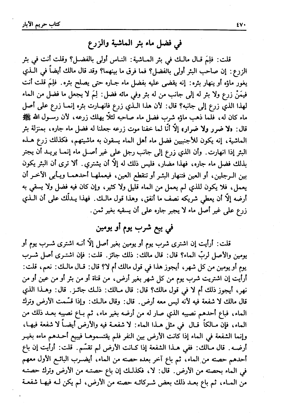 قَالَ: وَقَالَ مَالِكٌ: وَإِذَا قُسِمَتْ الْأَرْضُ وَتُرِك الْمَاءُ، فَبَاعَ أَحَدُهُمْ نُصِيبَهُ الَّذِي صَارَ لَهُ مَنْ أَرْضِهِ بِغَيْرِ مَاءٍ ثُمَّ بَاعَ نُصِيبَهُ بَعْدَ ذَلِكَ مَنْ الْمَاءِ، فَإِنَّ مَالِكًا قَالَ فِي مِثْلِ هَذَا الْمَاءِ: لَا شُفْعَةَ فِيهِ وَالْأَرْضُ أَيْضًا لَا شُفْعَةَ فِيهَا، وَإِنَّمَا الشُّفْعَةُ فِي الْمَاءِ إذَا كَانَتْ الْأَرْضُ بَيْنَ النَّفَرِ فَلَمْ يَقْتَسِمُوهَا فَيَبِيعُ أَحَدُهُمْ مَاءَهُ بِغَيْرِ أَرْضِهِ.