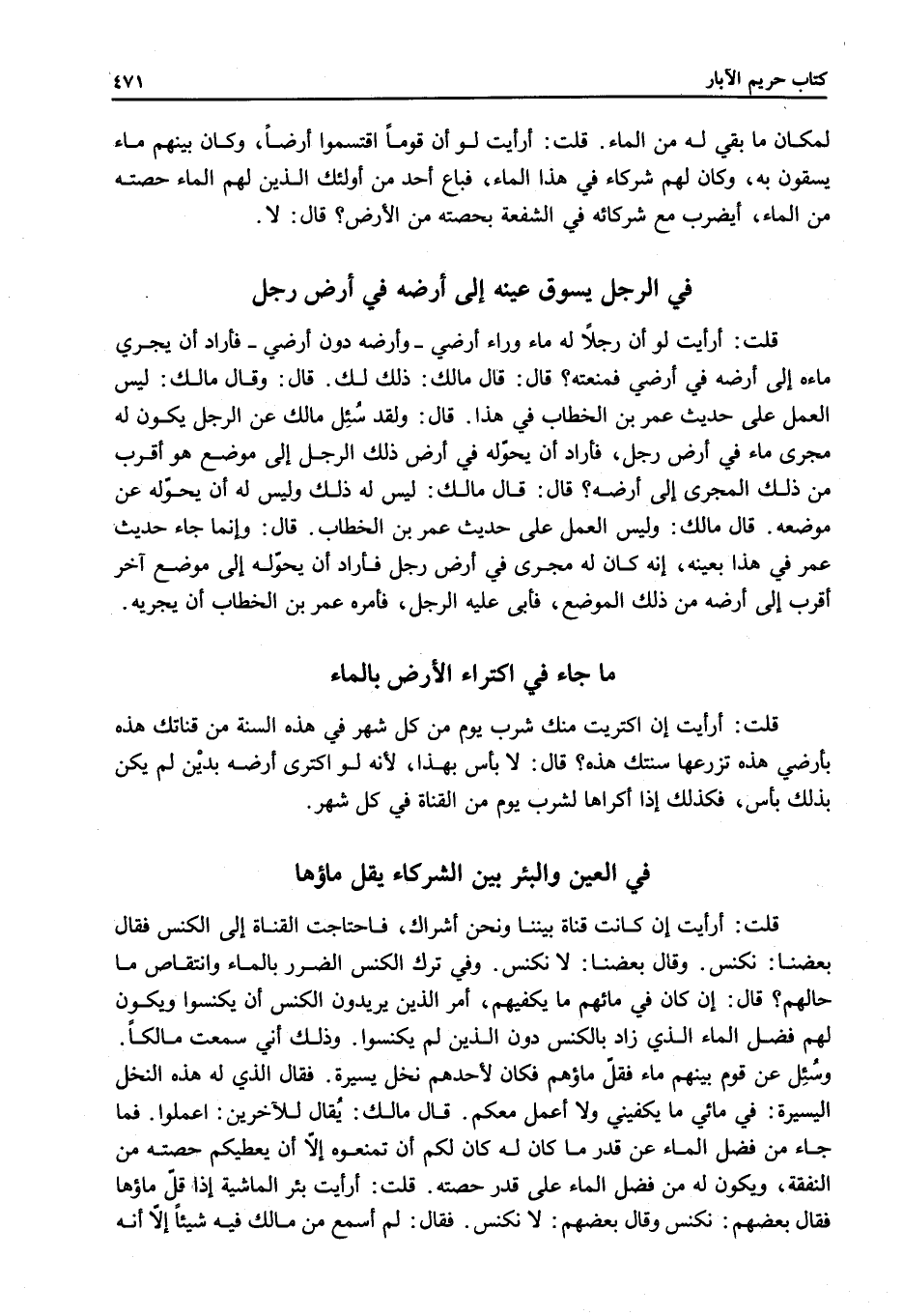 ٍ قُلْت: أَرَأَيْت لَوْ أَنَّ رَجُلًا لَهُ مَاءٌ وَرَاءَ أَرْضِي - وَأَرْضُهٌ دُونَ أَرْضِي - فَأَرَادَ أَنْ يَجْرِيَ مَاءَهُ إلَى أَرْضِهِ فِي أَرْضِي فَمَنَعْته؟ قَالَ: قَالَ مَالِكٌ: ذَلِكَ لَك. قَالَ: وَقَالَ مَالِكٌ: لَيْسَ الْعَمَلُ عَلَى حَدِيثِ عُمَرَ بْنِ الْخَطَّابِ فِي هَذَا. قَالَ: وَلَقَدْ سُئِلَ مَالِكٌ عَنْ الرَّجُلِ يَكُونُ لَهُ مَجْرَى مَاءٍ فِي أَرْضِ رَجُلٍ، فَأَرَادَ أَنْ يُحَوِّلَهُ فِي أَرْضِ ذَلِكَ الرَّجُلِ إلَى مَوْضِعٍ هُوَ أَقْرَبُ مِنْ ذَلِكَ الْمَجْرَى إلَى أَرْضِهِ؟