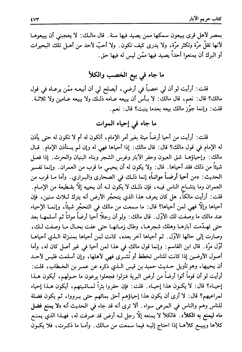 قُلْت: أَرَأَيْت لَوْ أَنَّ قَوْمًا أَتَوْا أَرْضًا مِنْ أَرْضِ الْبَرِّيَّةِ فَنَزَلُوا فَجَعَلُوا يَرْعَوْنَ مَا حَوْلَهُمْ، أَيَكُونُ هَذَا إحْيَاءً؟ قَالَ: لَا يَكُونُ هَذَا إحْيَاءً. قُلْت: فَإِنْ حَفَرُوا بِئْرًا لِمَاشِيَتِهِمْ، أَيَكُونُ هَذَا إحْيَاءً لِمَرَاعِيهِمْ؟ قَالَ: لَا أَرَى أَنْ يَكُونَ هَذَا إحْيَاؤُهُمْ أَحَقُّ بِمَائِهِمْ حَتَّى يُرْوَوْا، ثُمَّ يَكُونُ فَضْلَةً لِلنَّاسِ وَهُمْ وَالنَّاسُ فِي الْمَرْعَى سَوَاءٌ. أَلَا تَرَى أَنَّهُ قَدْ جَاءَ فِي الْحَدِيثِ أَنَّهُ «لَا يُمْنَعُ فَضْلُ مَاءٍ لِيُمْنَعَ بِهِ الْكَلَأُ» . فَالْكَلَأُ لَا يَمْنَعُهُ إلَّا رَجُلٌ لَهُ أَرْضٌ قَدْ عُرِفَتْ لَهُ، فَهَذَا الَّذِي يَمْنَعُ كَلَأَهَا وَيَبِيعُ كَلَأَهَا إذَا احْتَاجَ إلَيْهِ فِيمَا سَمِعْت مِنْ مَالِكٍ. وَأَمَّا مَا ذَكَرْت، فَلَا يَكُونُ