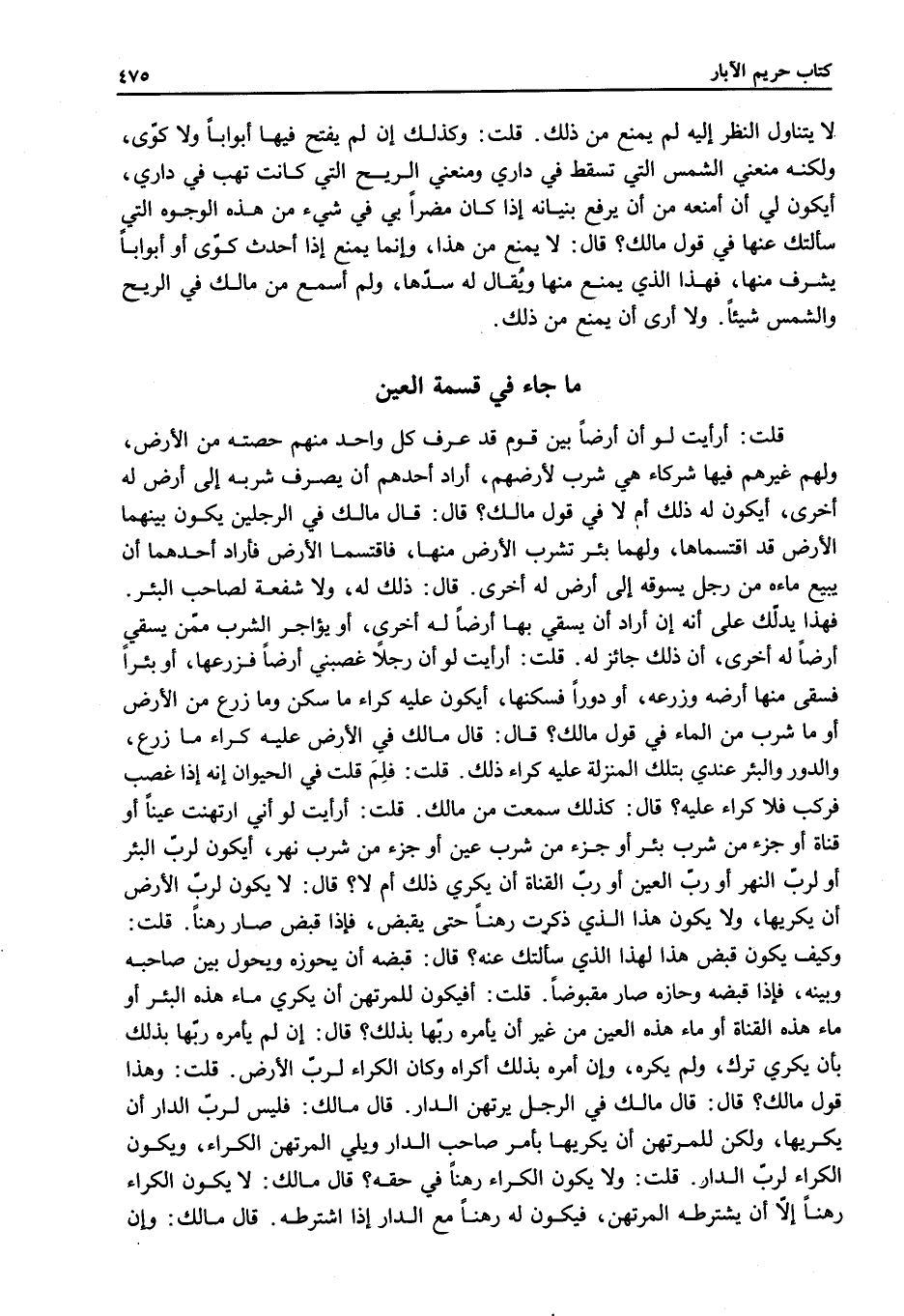 ِ قُلْت: أَرَأَيْت لَوْ أَنَّ أَرْضًا بَيْنَ قَوْمٍ قَدْ عَرَفَ كُلُّ وَاحِدٍ مِنْهُمْ حِصَّتَهُ مِنْ الْأَرْضِ، وَلَهُمْ غَيْرُهُمْ فِيهَا شُرَكَاءُ هِيَ شِرْبٌ لِأَرْضِهِمْ، أَرَادَ أَحَدُهُمْ أَنْ يَصْرِفَ شِرْبَهُ إلَى أَرْضٍ لَهُ أُخْرَى، أَيَكُونُ لَهُ ذَلِكَ أَمْ لَا فِي قَوْلِ مَالِكٍ؟