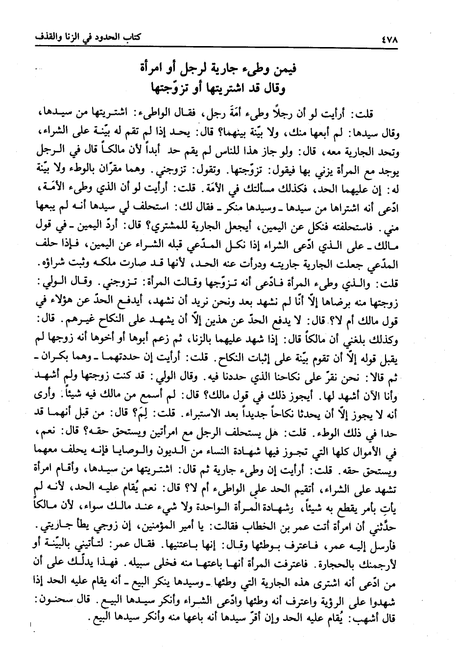 قَالَ: مِنْ قِبَلِ أَنَّهُمَا قَدْ حُدَّا فِي ذَلِكَ الْوَطْءِ. قُلْت: هَلْ يُسْتَحْلَفُ الرَّجُلُ مَعَ امْرَأَتَيْنِ وَيَسْتَحِقُّ حَقَّهُ قَالَ: نَعَمْ، فِي الْأَمْوَالِ كُلِّهَا الَّتِي تَجُوزُ فِيهَا شَهَادَةُ النِّسَاءِ مِنْ الدُّيُونِ وَالْوَصَايَا فَإِنَّهُ يَحْلِفُ مَعَهُمَا وَيَسْتَحِقُّ حَقَّهُ. قُلْت: أَرَأَيْت إنْ وَطِئَ جَارِيَةً ثُمَّ قَالَ: اشْتَرَيْتهَا مِنْ سَيِّدِهَا، وَأَقَامَ امْرَأَةً تَشْهَدُ عَلَى الشِّرَاءِ، أَتُقِيمُ الْحَدَّ عَلَى الْوَاطِئِ أَمْ لَا؟ قَالَ: نَعَمْ يُقَامُ عَلَيْهِ الْحَدُّ، لِأَنَّهُ لَمْ يَأْتِ بِأَمْرٍ يَقْطَعُ بِهِ شَيْئًا، وَشَهَادَةُ الْمَرْأَةِ الْوَاحِدَةِ وَلَا شَيْءَ عِنْدَ مَالِكٍ سَوَاءٌ، لِأَنَّ مَالِكًا حَدَّثَنِي أَنَّ امْرَأَةً أَتَتْ عُمَرَ بْنَ الْخَطَّابِ فَقَالَتْ: يَا أَمِيرَ الْمُؤْمِنِينَ، إنَّ زَوْجِي يَطَأُ جَارِيَتِي. فَأَرْسَلَ إلَيْهِ عُمَرُ، فَاعْتَرَفَ بِوَطْئِهَا وَقَالَ: إنَّهَا بَاعَتْنِيهَا. فَقَالَ عُمَرُ: لَتَأْتِيَنِّي بِالْبَيِّنَةِ أَوْ لَأَرْجُمَنَّكَ بِالْحِجَارَةِ. فَاعْتَرَفَتْ الْمَرْأَة أَنَّهَا بَاعَتْهَا مِنْهُ فَخَلَّى سَبِيلَهُ فَهَذَا يَدُلُّكَ عَلَى أَنَّ مَنْ ادَّعَى أَنَّهُ اشْتَرَى هَذِهِ الْجَارِيَةَ الَّتِي وَطِئَهَا - وَسَيِّدُهَا يُنْكِرُ الْبَيْعَ - أَنَّهُ يُقَامُ عَلَيْهِ الْحَدُّ إذَا شَهِدُوا عَلَى الرُّؤْيَةِ وَاعْتَرَفَ أَنَّهُ وَطِئَهَا وَادَّعَى الشِّرَاءَ وَأَنْكَرَ سَيِّدُهَا الْبَيْعَ.