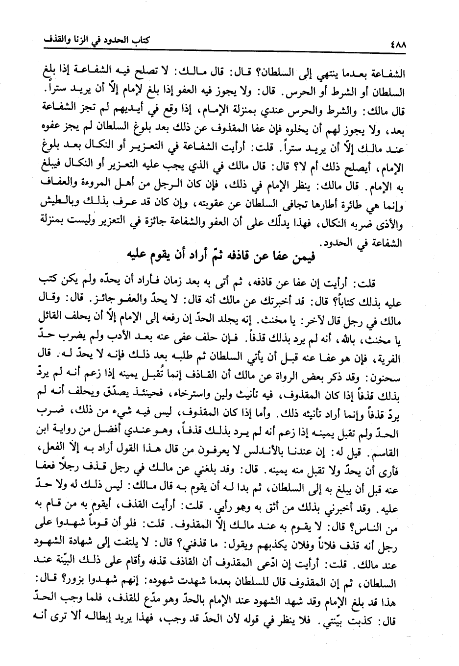 ِ قُلْتُ: أَرَأَيْتَ إنْ عَفَا عَنْ قَاذِفِهِ، ثُمَّ أَتَى بِهِ بَعْدَ زَمَانٍ فَأَرَادَ أَنْ يَحُدَّهُ وَلَمْ يَكُنْ كَتَبَ عَلَيْهِ بِذَلِكَ كِتَابًا؟ قَالَ: قَدْ أَخْبَرْتُكَ عَنْ مَالِكٍ أَنَّهُ قَالَ: لَا يُحَدُّ وَالْعَفْوُ جَائِزٌ. قَالَ: وَقَالَ مَالِكٌ فِي رَجُلٍ قَالَ لِآخَرَ: يَا مُخَنَّثُ. إنَّهُ يُجْلَدُ الْحَدَّ إنْ رَفَعَهُ إلَى الْإِمَامِ إلَّا أَنْ يَحْلِفَ الْقَائِلُ يَا مُخَنَّثُ، بِاَللَّهِ، أَنَّهُ لَمْ يُرِدْ بِذَلِكَ قَذْفًا. فَإِنْ حَلَفَ عَفَا عَنْهُ بَعْدَ الْأَدَبِ وَلَمْ يُضْرَبْ حَدَّ الْفِرْيَةِ، فَإِنْ هُوَ عَفَا عَنْهُ قَبْلَ أَنْ يَأْتِيَ السُّلْطَانُ ثُمَّ طَلَبَهُ بَعْدَ ذَلِكَ فَإِنَّهُ لَا يُحَدُّ لَهُ.