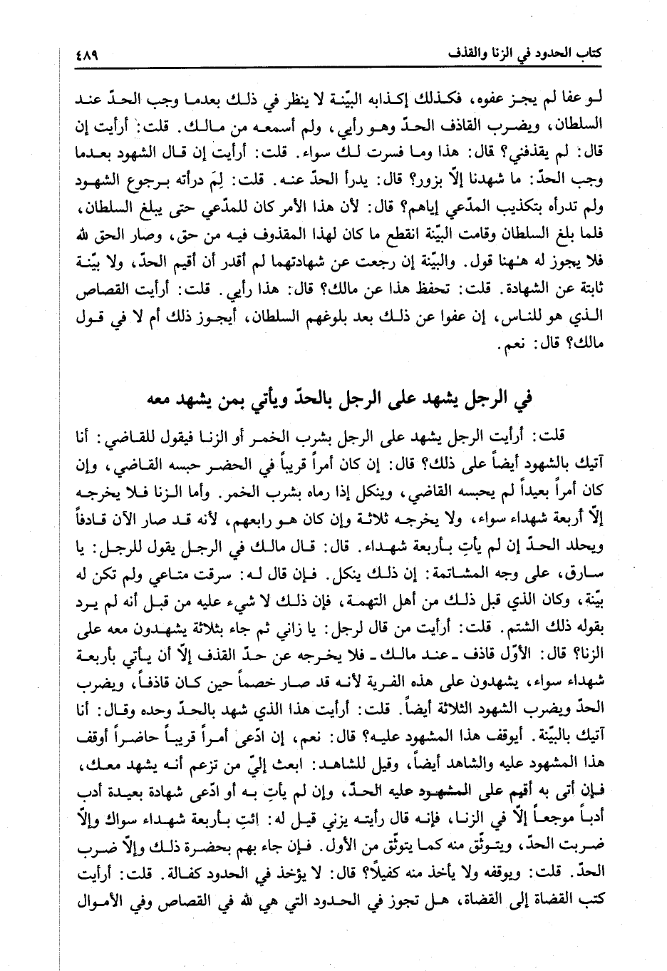قَالَ: قَالَ مَالِكٌ فِي الرَّجُلِ يَقُولُ لِلرَّجُلِ: يَا سَارِقُ، عَلَى وَجْهِ الْمُشَاتَمَةِ: إنَّ ذَلِكَ يُنَكَّلُ. فَإِنْ قَالَ لَهُ: سَرَقْتَ مَتَاعِي وَلَمْ تَكُنْ لَهُ بَيِّنَةٌ، وَكَانَ الَّذِي قِبَلَ ذَلِكَ مِنْ أَهْلِ التُّهْمَةِ، فَإِنَّ ذَلِكَ لَا شَيْءَ عَلَيْهِ مِنْ قِبَلِ أَنَّهُ لَمْ يَرُدَّ بِقَوْلِهِ ذَلِكَ الشَّتْمَ. قُلْت: أَرَأَيْت مَنْ قَالَ لِرَجُلٍ: يَا زَانِي ثُمَّ جَاءَ بِثَلَاثَةٍ يَشْهَدُونَ. مَعَهُ عَلَى الزِّنَا؟ قَالَ: الْأَوَّلُ قَاذِفٌ عِنْدَ مَالِكٍ فَلَا يُخْرِجُهُ عَنْ حَدِّ الْقَذْفِ إلَّا أَنْ يَأْتِيَ بِأَرْبَعَةِ شُهَدَاءَ سَوَاءٌ، يَشْهَدُونَ عَلَى هَذِهِ الْفِرْيَةِ لِأَنَّهُ قَدْ صَارَ خَصْمًا حِينَ كَانَ قَاذِفًا، وَيُضْرَبُ الْحَدَّ وَيُضْرَبُ الشُّهُودُ الثَّلَاثَةُ أَيْضًا. قُلْت: أَرَأَيْتَ هَذَا الَّذِي شَهِدَ بِالْحَدِّ وَحْدَهُ وَقَالَ: أَنَا آتِيَك بِالْبَيِّنَةِ. أَيُوقَفُ هَذَا الْمَشْهُودُ عَلَيْهِ؟ قَالَ: نَعَمْ، إنْ ادَّعَى أَمْرًا قَرِيبًا حَاضِرًا أُوقِفَ هَذَا الْمَشْهُودُ عَلَيْهِ وَالشَّاهِدُ أَيْضًا، وَقِيلَ لِلشَّاهِدِ: ابْعَثْ إلَيَّ مَنْ تَزْعُمُ أَنَّهُ يَشْهَدُ، مَعَك فَإِنْ أَتَى بِهِ أُقِيمَ عَلَى الْمَشْهُودِ عَلَيْهِ الْحَدُّ، وَإِنْ لَمْ يَأْتِ بِهِ أَوْ ادَّعَى شَهَادَةً بَعِيدَةً أُدِّبَ أَدَبًا مُوجِعًا إلَّا فِي الزِّنَا، فَإِنَّهُ قَالَ رَأَيْته يَزْنِي قِيلَ لَهُ: ائْتِ بِأَرْبَعَةِ شُهَدَاءَ. سِوَاك وَإِلَّا ضُرِبْت الْحَدَّ، وَيُتَوَثَّقُ مِنْهُ كَمَا يُتَوَثَّقُ مِنْ الْأَوَّلِ. فَإِنْ جَاءَ بِهِمْ بِحَضْرَةِ ذَلِكَ وَإِلَّا ضُرِبَ الْحَدَّ. قُلْت: وَيُوقِفُهُ وَلَا يَأْخُذُ مِنْهُ كَفِيلًا؟