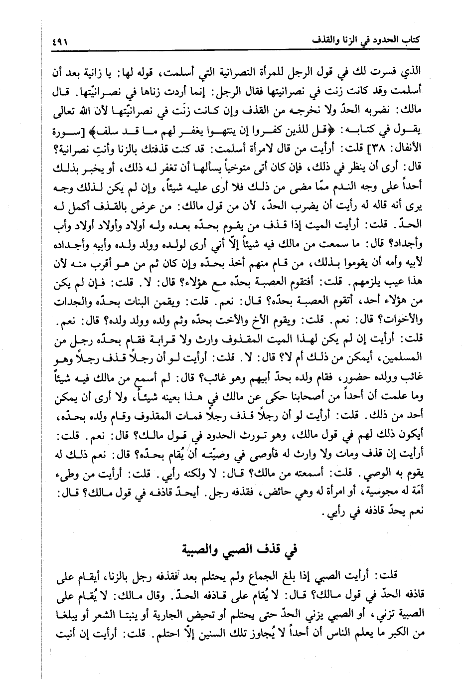 قَالَ مَالِكٌ: نَضْرِبُهُ الْحَدَّ وَلَا نُخْرِجُهُ مِنْ الْقَذْفِ وَإِنْ كَانَتْ زَنَتْ فِي نَصْرَانِيَّتِهَا لِأَنَّ اللَّهَ تَعَالَى يَقُولُ فِي كِتَابِهِ: {قُلْ لِلَّذِينَ كَفَرُوا إنْ يَنْتَهُوا يُغْفَرْ لَهُمْ مَا قَدْ سَلَفَ} [الأنفال: 38] سُورَةُ الْأَنْفَالِ قُلْتُ: أَرَأَيْتَ مَنْ قَالَ لِامْرَأَةٍ أَسْلَمَتْ: قَدْ كُنْتُ قَذَفْتُكِ بِالزِّنَا وَأَنْتِ نَصْرَانِيَّةٌ؟ قَالَ: أَرَى أَنْ يُنْظَرَ فِي ذَلِكَ، فَإِنْ كَانَ أَتَى مُتَوَخِّيًا يَسْأَلُهَا أَنْ تَغْفِرَ لَهُ ذَلِكَ، أَوْ يُخْبِرَ بِذَلِكَ أَحَدًا عَلَى وَجْهِ النَّدَمِ مِمَّا مَضَى مِنْ ذَلِكَ فَلَا أَرَى عَلَيْهِ شَيْئًا، وَإِنْ لَمْ يَكُنْ لَك وَجْهٌ يُرَى أَنَّهُ قَالَهُ لَهُ رَأَيْتُ أَنْ يُضْرَبَ الْحَدَّ، لِأَنَّ مِنْ قَوْلِ مَالِكٍ: مَنْ عَرَّضَ بِالْقَذْفِ أُكْمِلَ لَهُ الْحَدُّ.