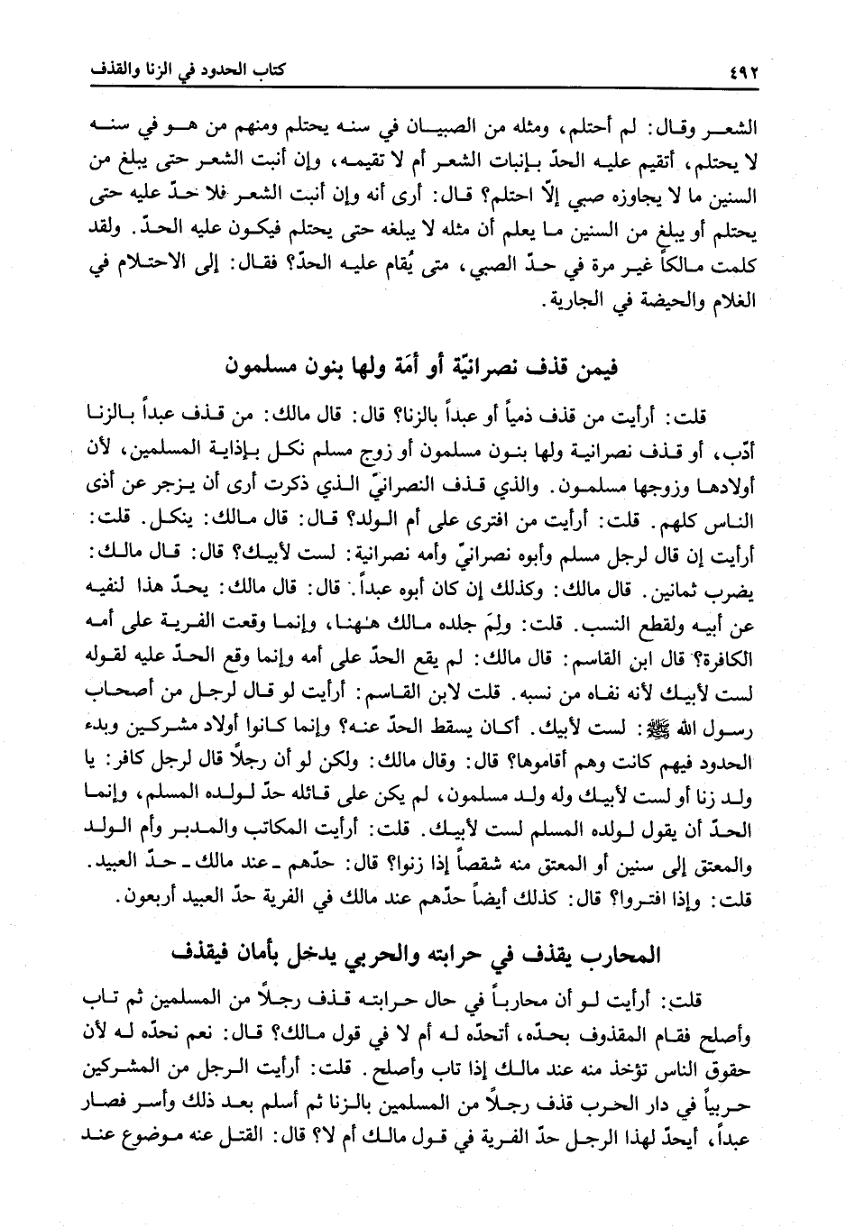 َ قُلْتُ: أَرَأَيْتَ مَنْ قَذَفَ ذِمِّيًّا أَوْ عَبْدًا بِالزِّنَا؟ قَالَ: قَالَ مَالِكٌ مَنْ قَذَفَ عَبْدًا بِالزِّنَا أُدِّبَ، أَوْ قَذَفَ نَصْرَانِيَّةً وَلَهَا بَنُونَ مُسْلِمُونَ أَوْ زَوْجٌ مُسْلِمٌ نُكِّلَ بِإِذَايَةِ الْمُسْلِمِينَ، لِأَنَّ أَوْلَادَهَا وَزَوْجَهَا مُسْلِمُونَ. وَاَلَّذِي قَذَفَ النَّصْرَانِيَّ الَّذِي ذَكَرْت أَرَى أَنْ يُزْجَرَ عَنْ أَذَى النَّاسِ كُلِّهِمْ.