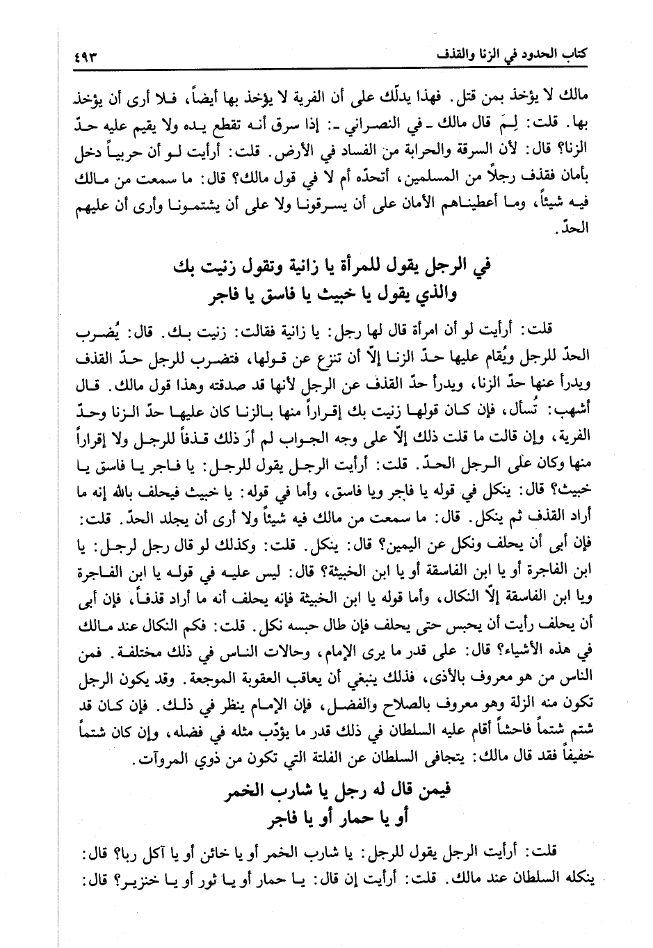 ُ قُلْتُ: أَرَأَيْتَ الرَّجُلَ يَقُولُ لِلرَّجُلِ: يَا شَارِبَ الْخَمْرِ أَوْ يَا خَائِنُ أَوْ يَا آكِلَ رِبًا؟ قَالَ: يُنَكِّلُهُ السُّلْطَانُ عِنْدَ مَالِكٍ.
