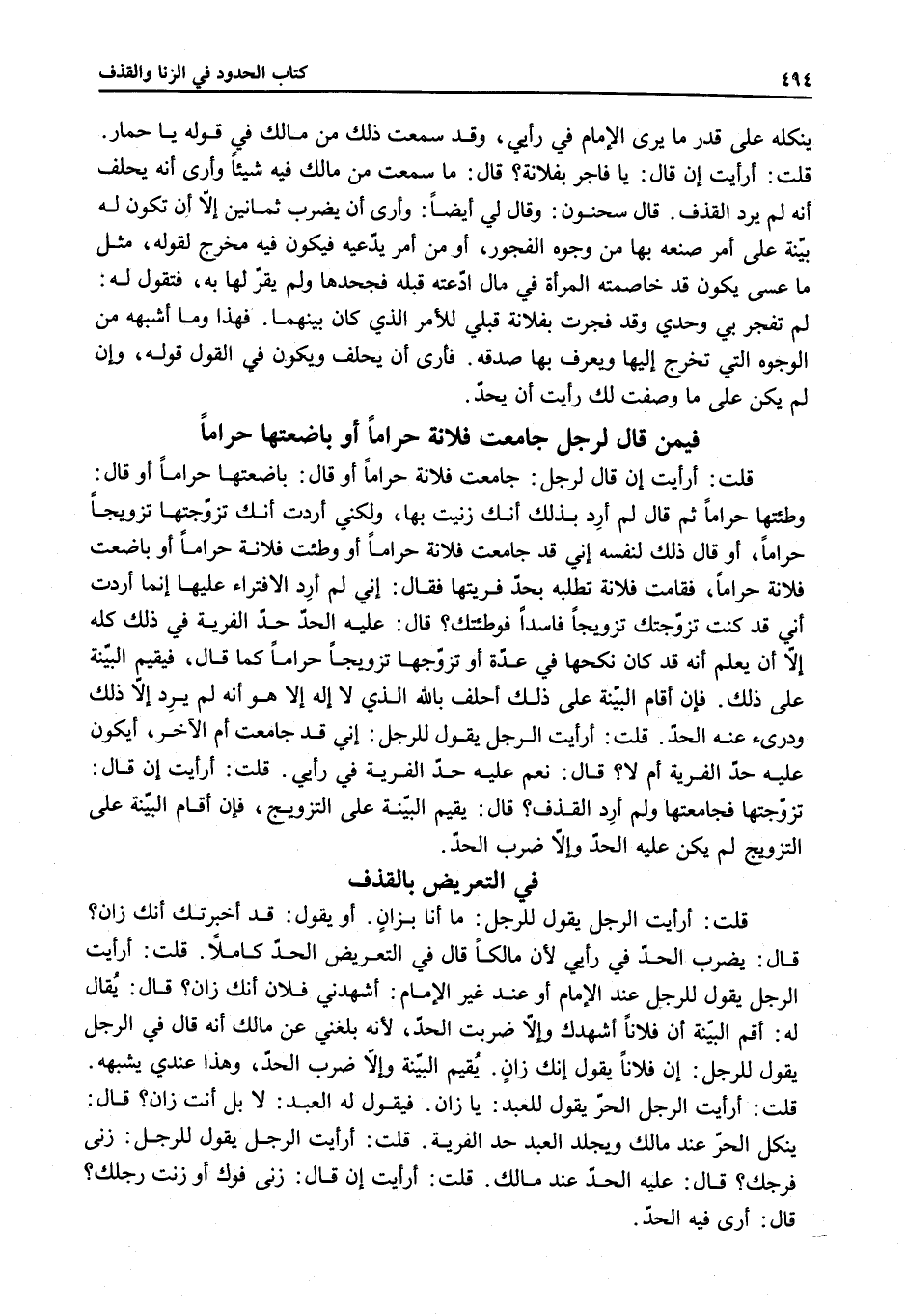 فِي التَّعْرِيضِ بِالْقَذْفِ قُلْت: أَرَأَيْت الرَّجُلَ يَقُولُ لِلرَّجُلِ: مَا أَنَا بِزَانٍ. أَوْ يَقُولُ: قَدْ أَخْبَرْتُك أَنَّك زَانٍ؟ قَالَ: يُضْرَبُ الْحَدَّ فِي رَأْيِي لِأَنَّ مَالِكًا قَالَ فِي التَّعْرِيضِ الْحَدُّ كَامِلًا. قُلْت: أَرَأَيْت الرَّجُلَ يَقُولُ لِلرَّجُلِ عِنْدَ الْإِمَامِ أَوْ عِنْدَ غَيْرِ الْإِمَامِ: أَشْهَدَنِي فُلَانٌ أَنَّك زَانٍ؟ قَالَ: يُقَالُ لَهُ: أَقِمْ الْبَيِّنَةَ أَنَّ فُلَانًا أَشْهَدَك وَإِلَّا ضُرِبْت الْحَدَّ، لِأَنَّهُ بَلَغَنِي عَنْ مَالِكٍ أَنَّهُ قَالَ فِي الرَّجُلِ يَقُولُ لِلرَّجُلِ: إنَّ فُلَانًا يَقُولُ إنَّك زَانٍ. يُقِيمُ الْبَيِّنَةَ وَإِلَّا ضُرِبَ الْحَدَّ، وَهَذَا عِنْدِي يُشْبِهُهُ. قُلْت: أَرَأَيْت الرَّجُلَ الْحُرَّ يَقُولُ لِلْعَبْدِ: يَا زَانٍ. فَيَقُولُ لَهُ الْعَبْدُ: لَا بَلْ أَنْتَ زَانٍ؟ قَالَ: يُنَكَّلُ الْحُرُّ عِنْدَ مَالِكٍ وَيُجْلَدُ الْعَبْدُ حَدَّ الْفِرْيَةِ. قُلْت: أَرَأَيْت الرَّجُلَ يَقُولُ لِلرَّجُلِ: زَنَى فَرْجُك؟ قَالَ: عَلَيْهِ الْحَدُّ عِنْدَ مَالِكٍ. قُلْت: أَرَأَيْت إنْ قَالَ: زَنَى فُوك أَوْ زَنَتْ رِجْلُك؟ قَالَ: أَرَى فِيهِ الْحَدَّ.