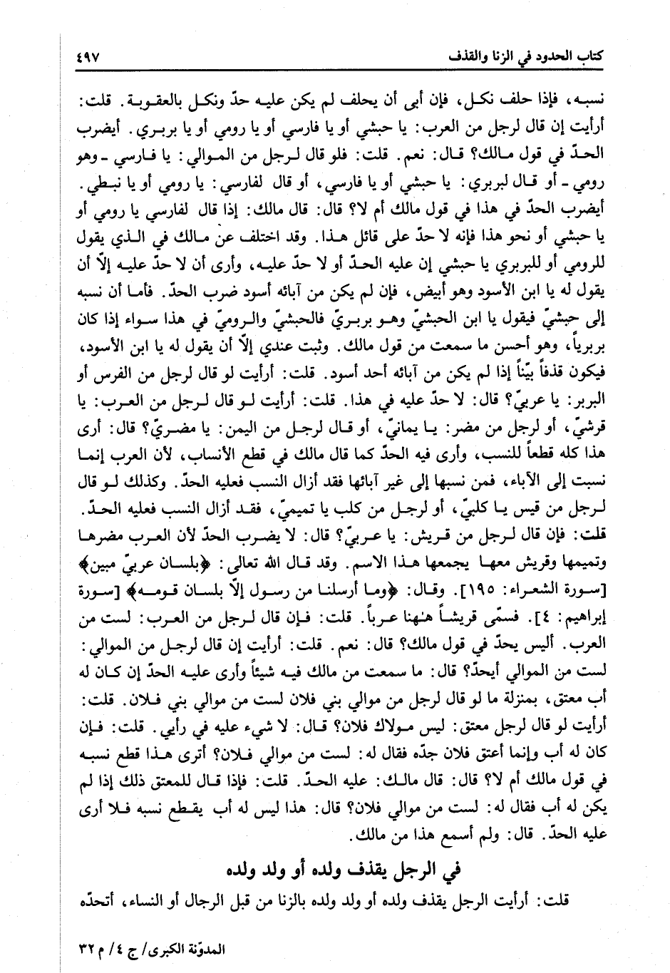 فِي الرَّجُلِ يَقْذِفُ وَلَدَهُ أَوْ وَلَدَ وَلَدِهِ قُلْت: أَرَأَيْت الرَّجُلَ يَقْذِفُ وَلَدَهُ أَوْ وَلَدَ وَلَدِهِ بِالزِّنَا مِنْ قِبَلِ الرِّجَالِ أَوْ النِّسَاءِ، أَتَحُدُّهُ