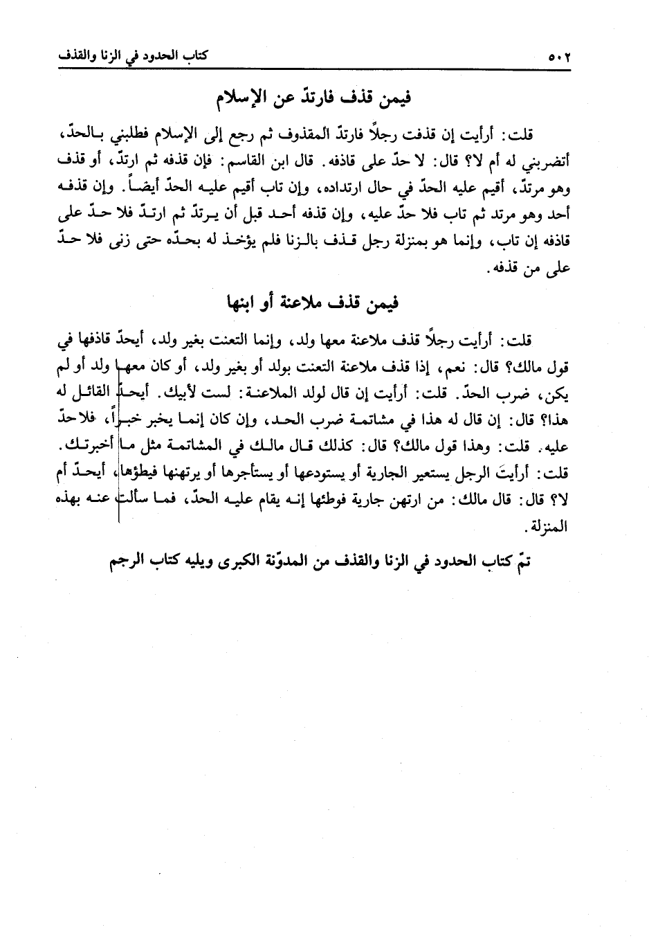 قَالَ: لَا حَدَّ عَلَى قَاذِفِهِ. قَالَ ابْنُ الْقَاسِمِ: فَإِنْ قَذَفَهُ ثُمَّ ارْتَدَّ، أَوْ قَذَفَ وَهُوَ مُرْتَدٌّ، أُقِيمَ عَلَيْهِ الْحَدُّ فِي حَالِ ارْتِدَادِهِ، وَإِنْ تَابَ أُقِيمَ عَلَيْهِ الْحَدُّ أَيْضًا. وَإِنْ قَذَفَهُ أَحَدٌ وَهُوَ مُرْتَدٌّ ثُمَّ تَابَ فَلَا حَدَّ عَلَيْهِ، وَإِنْ قَذَفَهُ أَحَدٌ قَبْلَ أَنْ يَرْتَدَّ ثُمَّ ارْتَدَّ فَلَا حَدَّ عَلَى قَاذِفِهِ إنْ تَابَ، وَإِنَّمَا هُوَ بِمَنْزِلَةِ رَجُلٍ قُذِفَ بِالزِّنَا فَلَمْ يُؤْخَذْ لَهُ بِحَدِّهِ حَتَّى زَنَى فَلَا حَدَّ عَلَى مَنْ قَذَفَهُ.
