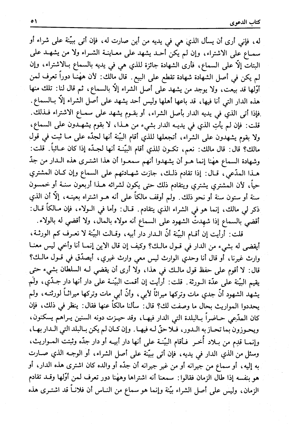 قَالَ: سَأَلْنَا مَالِكًا عَنْهَا فَقَالَ: يُنْظَرُ فِي ذَلِكَ، فَإِنْ كَانَ الْمُدَّعِي حَاضِرًا بِالْبَلْدَةِ الَّتِي الدَّارُ فِيهَا، وَقَدْ حِيزَتْ دُونَهُ السِّنِينَ يَرَاهُمْ يَسْكُنُونَ، وَيَحُوزُونَ بِمَا تُحَازُ بِهِ الدُّورُ، فَلَا حَقَّ لَهُ فِيهَا. وَإِنْ كَانَ لَمْ يَكُنْ بِالْبَلَدِ الَّتِي الدَّارُ بِهَا، وَإِنَّمَا قَدِمَ مِنْ بِلَادٍ أُخَرَ فَأَقَامَ الْبَيِّنَةَ عَلَى أَنَّهَا دَارُ أَبِيهِ أَوْ دَارُ جَدِّهِ وَثَبَتَتْ الْمَوَارِيثُ، وَسُئِلَ مَنْ الَّذِي الدَّارُ فِي يَدَيْهِ، فَإِنْ أَتَى بِبَيِّنَةٍ عَلَى أَصْلِ الشِّرَاءِ، أَوْ الْوَجْهِ الَّذِي صَارَتْ بِهِ إلَيْهِ، أَوْ سَمَاعٍ مِنْ جِيرَانِهِ أَوْ مِنْ غَيْرِ جِيرَانِهِ أَنَّ جَدَّهُ أَوْ وَالِدَهُ كَانَ اشْتَرَى هَذِهِ الدَّارَ، أَوْ هُوَ بِنَفْسِهِ إذَا طَالَ الزَّمَانُ فَقَالُوا: سَمِعْنَا أَنَّهُ اشْتَرَاهَا وَهَهُنَا دُورٌ تُعْرَفُ لِمَنْ أَوَّلُهَا وَقَدْ تَقَادَمَ الزَّمَانُ، وَلَيْسَ عَلَى أَصْلِ الشِّرَاءِ بَيِّنَةٌ وَإِنَّمَا هُوَ سَمَاعٌ مِنْ النَّاسِ أَنَّ فُلَانًا قَدْ اشْتَرَى هَذِهِ